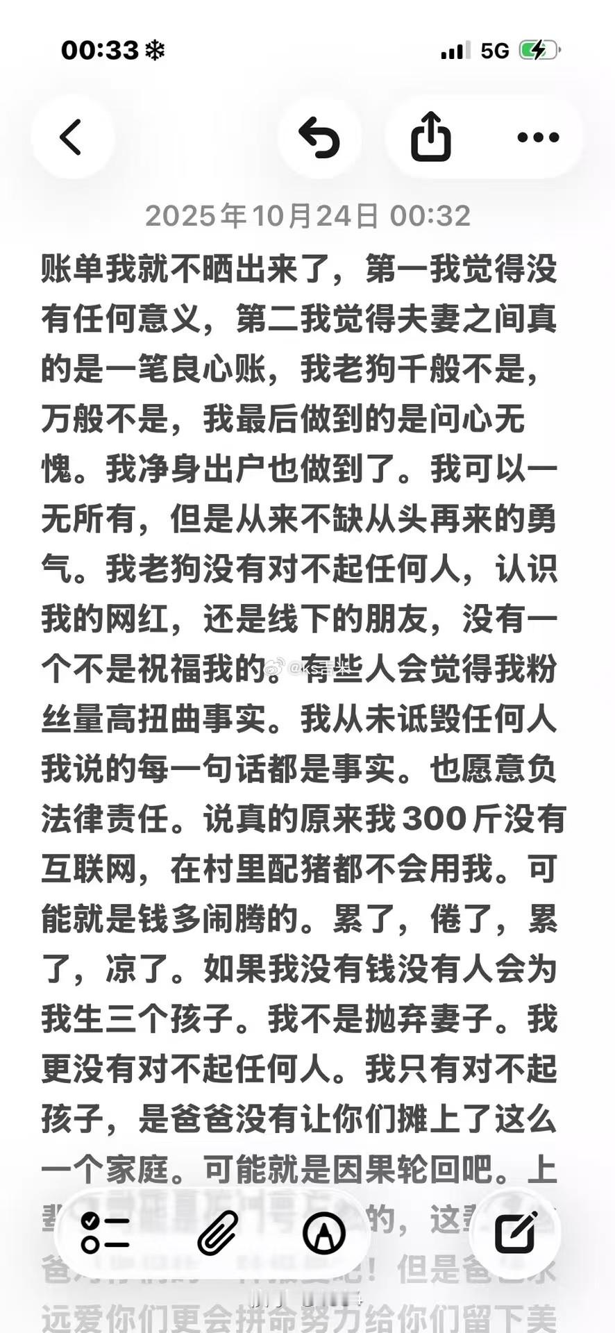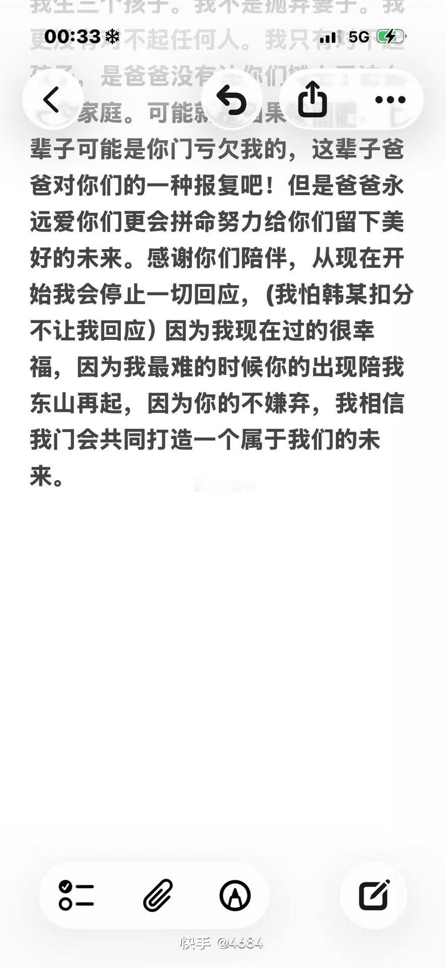老狗发文表示亏欠孩子,没能给孩子一个完整的家庭,但会努力挣钱给孩子一个美好的未来,同时示爱新女友,在自己最难的时候陪自己东山再起…