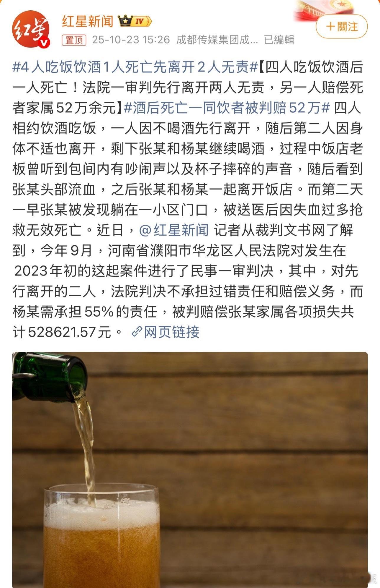 4人吃饭饮酒1人死亡先离开2人无责4人同桌饮酒,1人不幸离世,先离开的2人被认定无责——不是“走得早”就没事,是他俩全程没劝酒、没灌酒,发现同伴状态正常才先行离开,既没“硬劝”的过错,也无“放任危险”的疏忽。