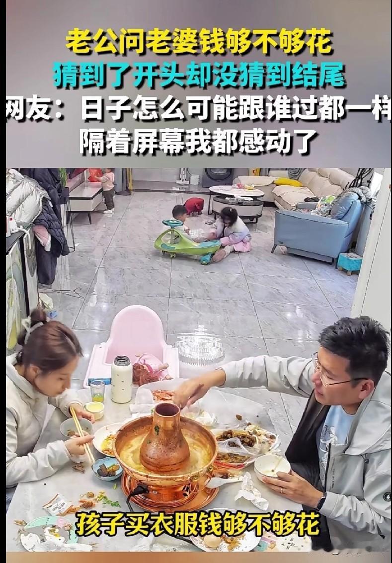 家人们快来看这对夫妻的神仙互动!老公问老婆钱够不够花,本以为是常规关心,结果看到结尾直接破防了! 就看他俩吃着火锅,老公一句“孩子买衣服钱够不够花”,那语气里的体贴真绝了。网友都说“日子怎么可能跟谁过都一样”,隔着屏幕都被这双向奔赴的温柔感动到了! 这才是婚姻该有的样子啊,不是单方面的付出,而是彼此惦记、互相支撑。这样的感情谁不羡慕?希望大家都能遇到把你放在心尖上的人,把日子过成暖暖的模样~