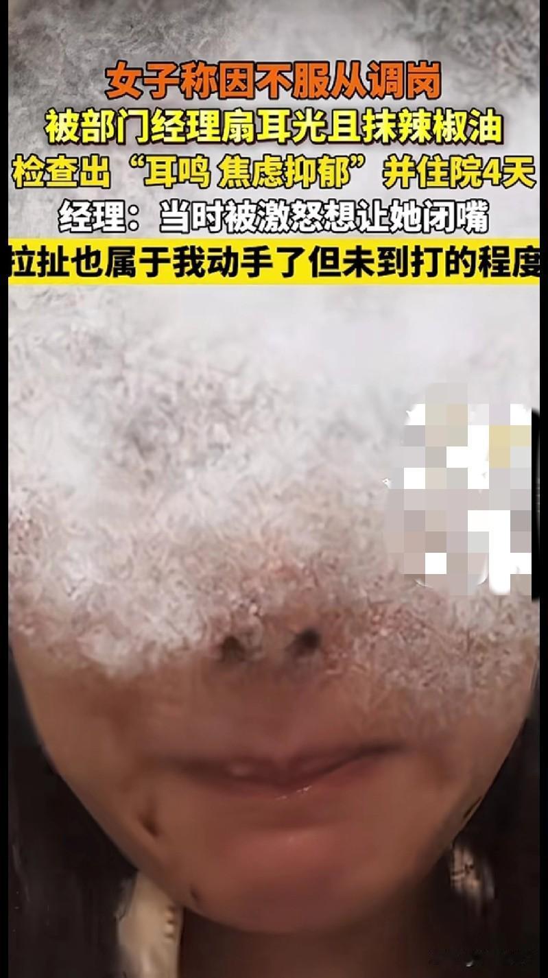 家人们快看这离谱事!一女子就因为不服从调岗,被部门经理扇耳光还抹辣椒油!结果检查出耳鸣、焦虑抑郁,住院4天。更气人的是经理还说“当时被激怒想让她闭嘴,拉扯不算打”。 咱就说,这都扇耳光抹辣椒油了,还不算打?这经理怕不是活在清朝吧!职场霸凌到这份上,也太嚣张了。 打工人在职场遇到这种事可不能忍,该维权就维权,身体和尊严都不能被这么欺负。希望这姐妹能讨回公道,也提醒大家遇到职场暴力一定要勇敢站出来!
