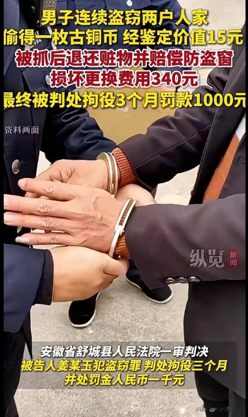 家人们快来看这离谱操作!安徽一男子连续偷了两户人家,就为了一枚古铜币,结果鉴定才值15块! 被抓后不仅得退还赃物,还得赔340块防盗窗损坏费,最后被判拘役3个月还罚款1000块。咱就说,为了15块钱,把自己整进局子还赔了这么多,这小偷怕不是喝多了吧? 这事儿也提醒大家,千万别干违法的事,不然就算偷的东西不值钱,照样得付出惨痛代价!真是偷鸡不成蚀把米,亏大了!
