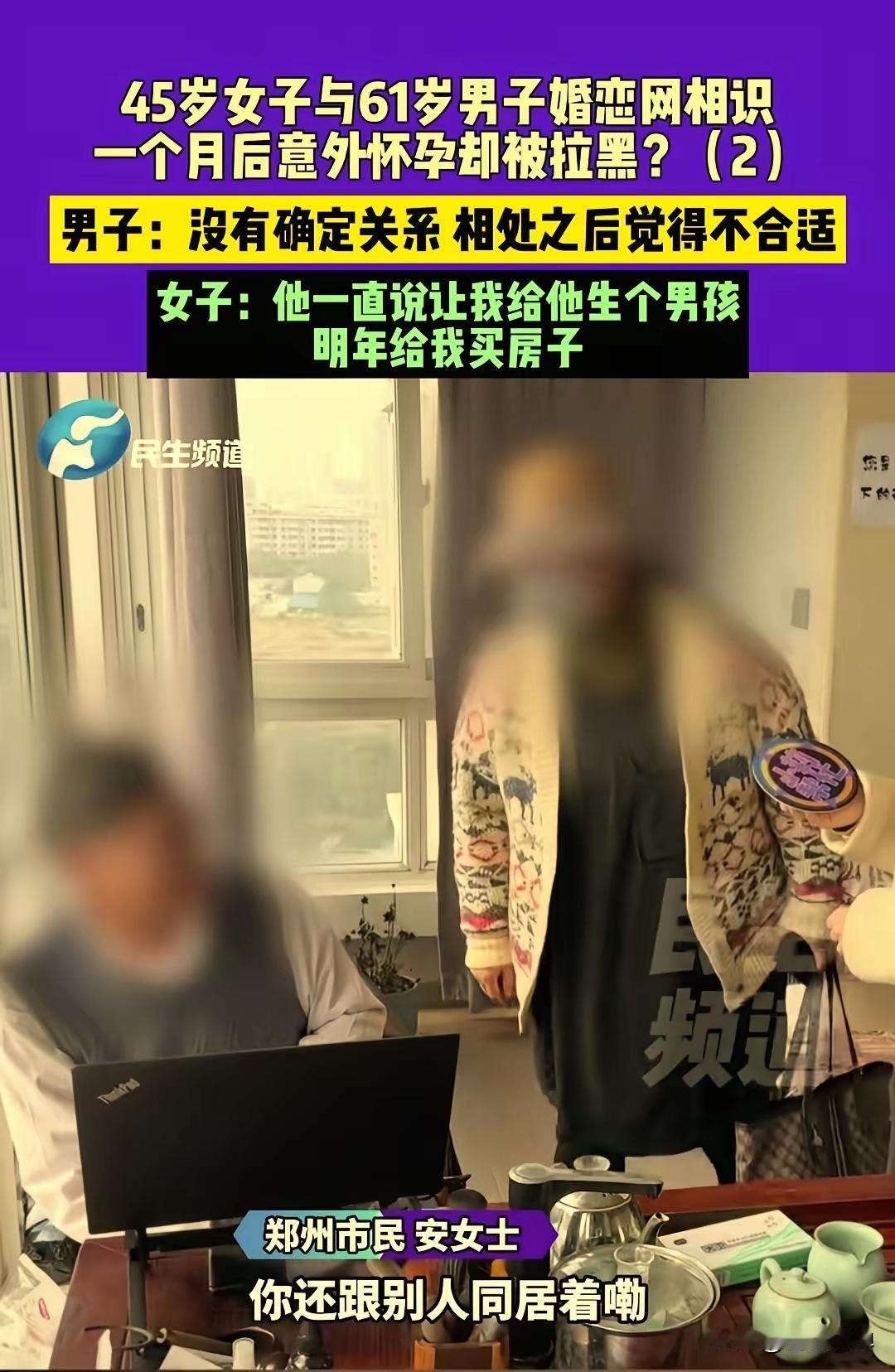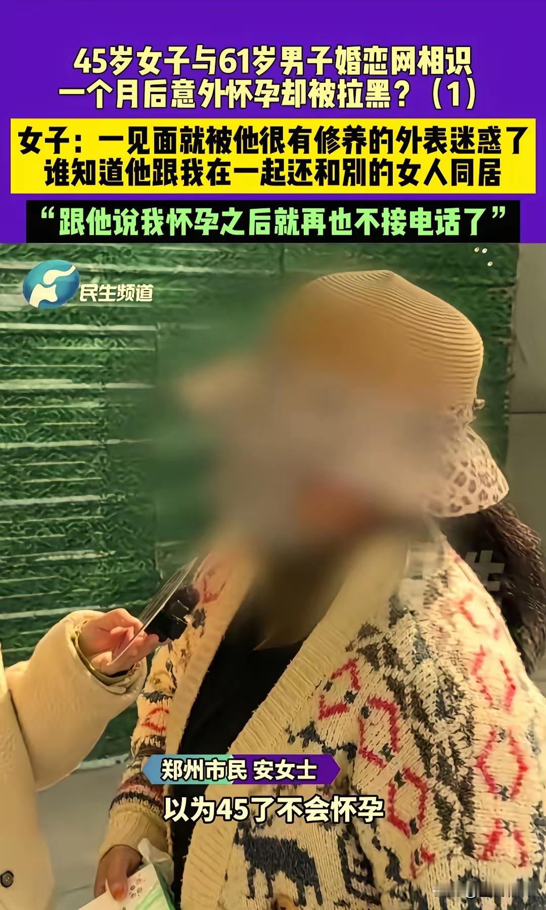近日在河南郑州,安女士说她也不敢相信,自己45岁了还会怀孕,现在知道这个结果和五雷轰顶一样,接受了不了这个事实,自己单身还带着一个孩子。 45岁女子和61岁男子在婚恋网认识,相处一个月后女子怀孕,结果男子知道后,电话也不接了还把女子拉黑,女子说一见面就被他很有修养的外表迷惑了。 安女士这会儿可真是欲哭无泪啊,她原本以为这辈子就这么平平淡淡过下去了,单身带着孩子打拼,日子虽说不容易,可也习惯了。谁知道一场网络邂逅,把她的生活搅得天翻地覆。她回忆说,那个男的看起来文质彬彬,说话挺有礼貌,见面时还主动帮忙拎包,谁能想到背后藏着这么一出?现在怀孕的事儿一出来,她整天睡不好觉,工作也分心,孩子还小,她得一个人扛起所有。邻居们议论纷纷,有人说她太天真,有人同情她运气差,可安女士自己心里明白,这事儿没那么简单,她开始怀疑自己是不是被算计了。 其实呢,这个故事让我们不得不思考,网络婚恋平台到底靠不靠谱?安女士是通过一个热门婚恋网站认识那个61岁男子的,平台宣传得天花乱坠,说什么严格审核、安全可靠。结果呢?见面才一个月就出这种事,男方一听到怀孕消息,立马玩消失,连个解释都没有。这不是明摆着平台监管有问题吗?很多这类网站只顾着赚钱,用户信息随便填填就能注册,根本不去核实身份背景。安女士说,她当初看中男方的资料上写着“退休干部、有房有车”,现在想想,说不定全是假的。平台要是多花点心思,设置一些实名认证或者背景调查,可能就不会有这种悲剧了。可现实是,这些平台往往把责任推给用户,说什么“自行判断风险”,这不是在推卸责任吗?安女士的经历不是个例,网上随便一搜,就能看到好多类似的故事,有人被骗钱,有人被欺骗感情,平台却总是轻描淡写地带过。 再说说那个61岁的男子,他的行为也太不负责任了。安女士说他外表有修养,可内里呢?一听说怀孕,电话不接、微信拉黑,这算什么男人?年龄大了,按理说该更成熟稳重,结果他倒好,一走了之,连面对现实的勇气都没有。安女士现在得独自面对怀孕的后果,可能还得考虑要不要生下来,生下来怎么养,这可不是小事。她本来就是个单身妈妈,经济压力大,现在又添一口人,日子怎么过?那个男的倒是轻松,躲起来就当没事发生。这种行为不仅伤害了安女士,还暴露了社会上一些人对感情的不尊重。他们觉得网络上的关系来得快去得也快,不用负责任,可实际上,这背后是深深的性别不平等。女性往往在感情里投入更多,一旦出事,承担后果的总是她们。安女士45岁了,怀孕风险本来就高,现在还得担心健康问题,那个男的却连一句安慰都没有,这公平吗? 话说回来,安女士的遭遇也让我们看到,中年女性在婚恋市场上的困境。她45岁,还带着孩子,本来就想找个伴安稳过日子,结果遇上这种事。社会上总有人说,年纪大了就别折腾了,可谁不想有个依靠?安女士说,她当初在婚恋网上注册,就是因为身边朋友劝她试试,说网络机会多。可现在呢?机会没等到,等来的是打击。年龄差距大的关系,本来就容易出问题,一方可能图个新鲜,另一方却动了真情。安女士被那个61岁男子的外表迷惑,这不全是她的错,社会对中年女性的压力太大了,她们常常被灌输“赶紧找个人嫁了”的观念,结果匆忙中就容易看走眼。其实,感情的事急不来,可现实是,很多人像安女士一样,被逼到角落里,只能靠网络去碰运气。 网络婚恋本身不是坏事,它给很多人提供了机会,可如果平台不加强管理,用户不提高警惕,悲剧就会一再上演。安女士现在正考虑要不要通过法律途径维权,可这过程多漫长啊,她得收集证据、找律师,还得面对外界的指指点点。那个男的拉黑她,连个联系方式都没留,维权起来难上加难。这让我们反思,社会是不是该多提供一些支持?比如婚恋平台引入第三方仲裁,或者政府加强监管,让这些虚拟世界的承诺更有保障。安女士的故事不是孤立的,它提醒我们,在追求感情的路上,得多留个心眼,别被外表蒙蔽了双眼。 各位读者你们怎么看?欢迎在评论区讨论。