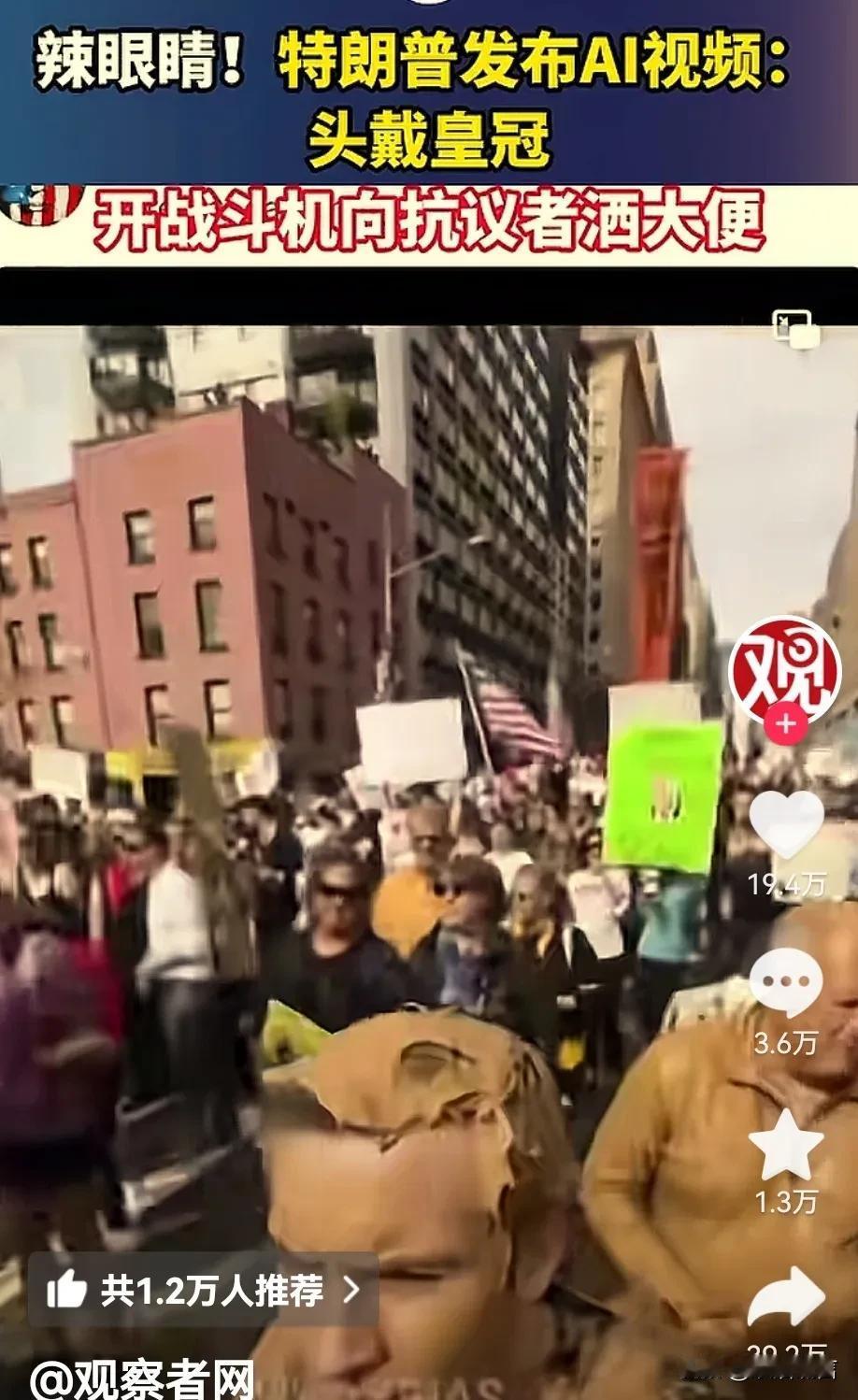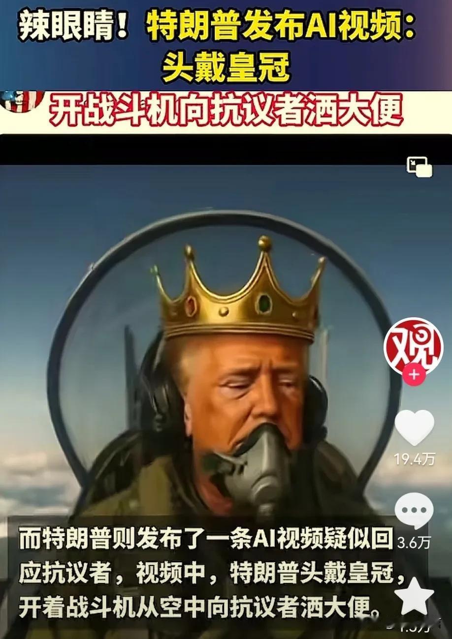 见过恶心的人,没有见过这么恶心且没有素质的人,作为一个国家总统,作出这样的事简直就是“恬不知耻”! 美国总统特朗普太离谱了,目前美国大游行,对特朗普暴政不满,特朗普制作了一个ai视频,视频就是他驾驶战机对700万游行市民洒大便💩,还还是人吗? 作为一个国家总统,基本素质都没有,美国人也是自作自受,这可是你们自己选出来的总统。 本来应该进行平息此事,他确把这件事侮辱自己国民,这不是美国人悲哀也是美国人耻辱! 特朗普是不是一个搞笑的总统[笑哭][笑哭]不知道特朗普有没有驾屎证呢?[捂脸][捂脸]还是说特朗普开战机……泄粪[笑哭][笑哭] 特朗普作出离谱之极之事,侮辱自己国民