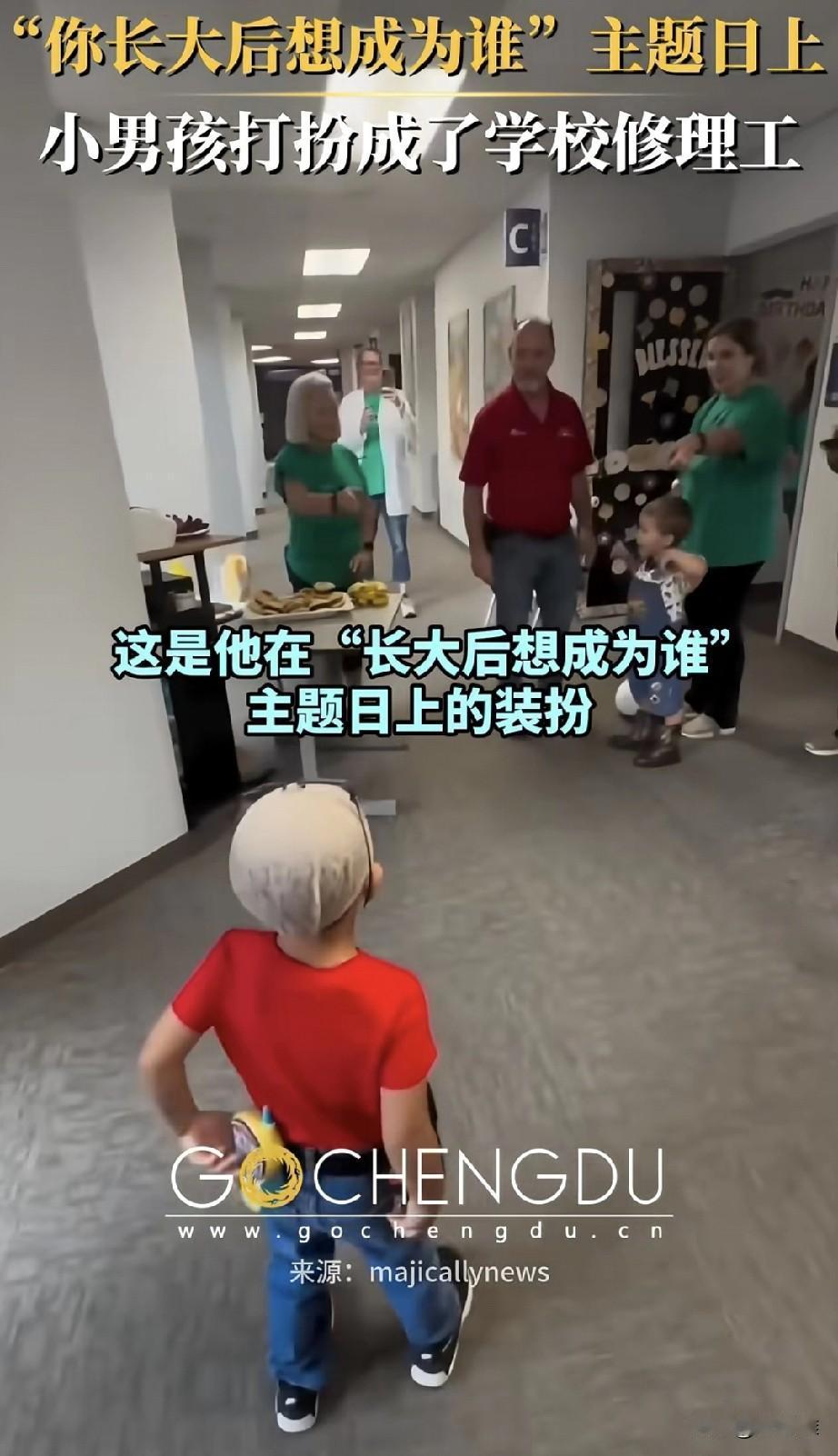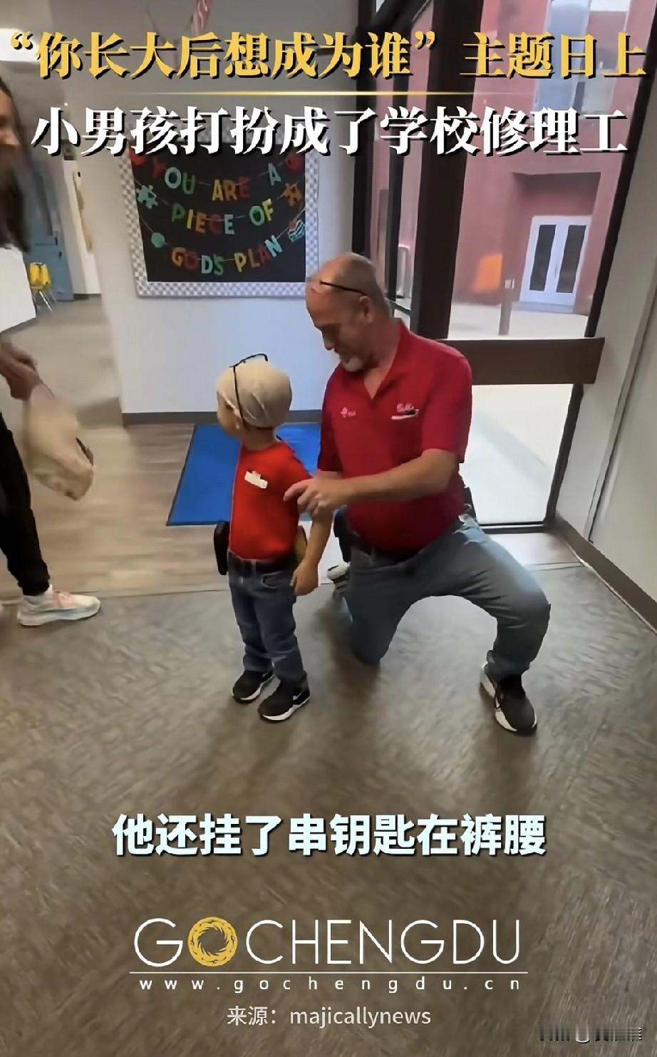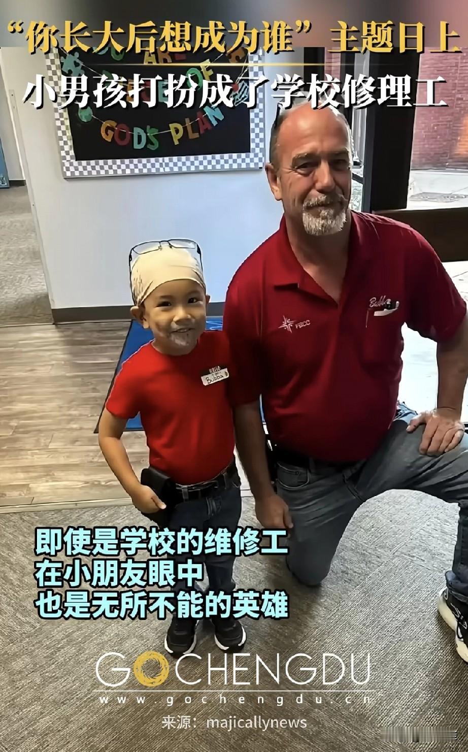 这是国外一所小学举办的主题日活动,让孩子打扮成想成为的那个人的模样,有个小男孩把自己装扮成了学校修理工,引得老师和修理工哈哈大笑,此刻在他眼里学校的修理工就是他心中的大英雄,因为修理工可以让熄灭的灯泡亮起来,让坏掉的风扇转起来,让零散的桌椅重新立起来! 站在成年人的角度看,很多国内的人根本都不懂,在欧美国家当维修员的“含金量”很高的,可以说在场的人没有一个有他工资高。而且他工作还不累,没东西修就摸鱼一天,有东西修就慢慢摸洋工,而且不担心会被炒,因为供不应求!