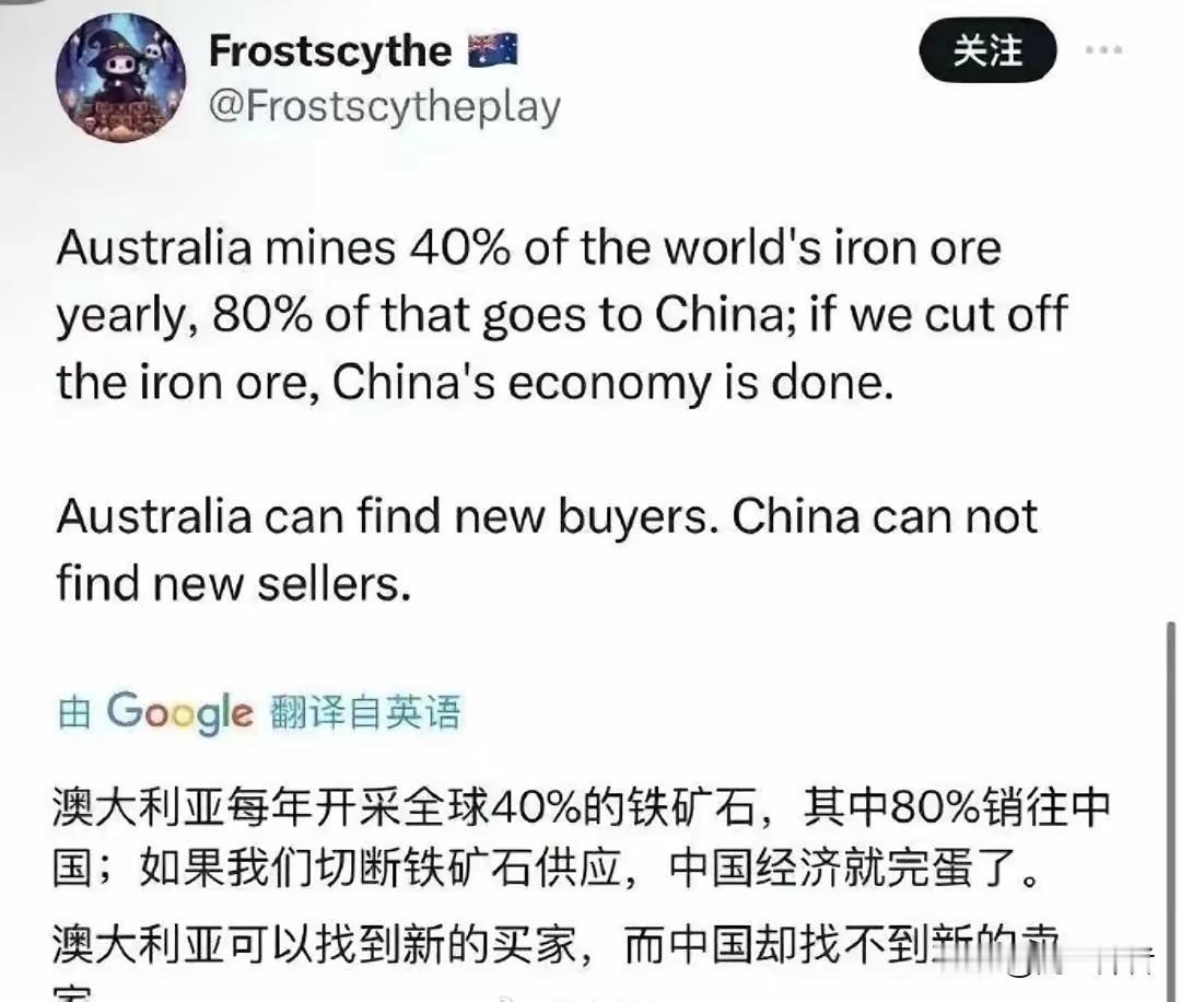 一位澳大利亚网友发文称澳大利亚每年开采的铁矿石占世界40%,其中80%销往中国,如果澳大利亚狠心切断铁矿石供应,中国的经济就完了,因为澳大利亚可以找到新买家,但中国找不到了新卖家! 看完这个,我估计这位澳大利亚平时肯定不太关注自己国家的新闻。澳大利亚铁矿石储藏量丰富这个是不争的事实,但是你有完整的加工提炼产业链吗?没技术,你只能卖原材料,不然就是一堆不能变现的废石。 而我们中国是打开门做生意,不买澳大利亚铁矿石,我们全世界可以替代澳大利亚铁矿石的国家有很多。例如巴西是全球第二大铁矿石生产国,2024年产量为4.4亿吨,也是澳大利亚的替代买家,俄罗斯、伊朗、几内亚都在等中国的这个大金主。 今天才发现西方人骨髓里的傲慢竟然来自于无知和愚昧!