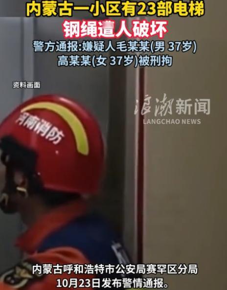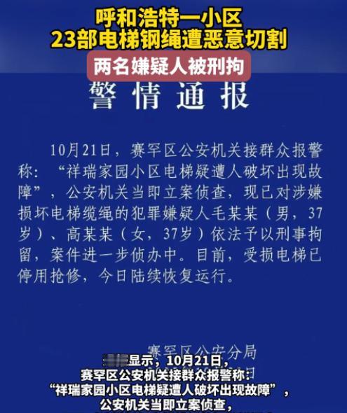 内蒙古呼和浩特,居民乘电梯时听见轿厢“咯吱咯吱”异响,赶快下电梯后告知物业,维保人员检查后,倒吸冷气,原来23部电梯的关键承重钢绳全被人故意割断!这简单拿居民生命当儿戏,要是没人及时发现,满载乘客的电梯失控坠落,后果根本不敢想!居民们又慌又气,报警后,帽子叔叔很快抓住犯罪人员。 10 月 23 号那天,呼和浩特一小区的业主群里炸了。 有人转发了小区微信公众号的警情通报,说剪电梯钢绳的俩嫌疑人抓住了! 一个姓毛一个姓高,都是 37 岁,已经被刑事拘留。 群里先是一阵欢呼,可没几分钟,质疑的消息就刷了屏:“他俩咋进的电梯机房?那地方得专用钥匙啊!” “23 部电梯全破坏,肯定熟门熟路,不会是‘自己人’吧?” 这些疑问不是空穴来风,现在小区里还有不少人在为电梯犯愁。 谁能想到,这一切的起点,只是一声电梯异响。 10 月下旬一个清晨,张女士提着包进 1 号楼电梯,刚按完 12 楼,就听见 “咯吱 —— 嘎啦” 的怪响,轿厢还轻轻晃了晃。 她当时手心就冒了汗,没等门关上就冲了出去,转身就往物业跑。 物业赶紧叫来了维保的李师傅,可谁也没料到,这一查竟查出个大隐患。 李师傅拿着专用钥匙打开机房门,手电筒一照就傻了眼:手指粗的承重钢绳上,几道斜切痕看得清清楚楚,边缘还挂着金属屑。 他赶紧喊来俩同事,从 2 号楼查到 7 号楼,越查心越沉。 俩小时后,结果出来了 ——50 部电梯里,23 部的钢绳都被人动了手! 7 号楼那部最吓人,钢绳外层全断,只剩几根细铁丝吊轿厢,一碰就晃,看得人头皮发麻。 消息传开后,小区里炸开了锅。 有人站在电梯口拍胸口后怕:“我前一天还坐过 7 号楼的电梯!” 有人气得直骂:“这是拿人命当儿戏!” 业委会当天就带着证据去报警,警方很快到现场拉了警戒线,调了所有监控。 从小区大门到机房附近的隐蔽摄像头,挨个仔细看,就盼着能找出线索。 现在虽然嫌犯抓了,部分电梯也修好了,但居民们的担心没少。 有网友质疑:俩嫌犯能轻松进电梯机房,还精准破坏 23 部电梯,肯定对小区情况了如指掌,不是物业员工就是前员工,或者合作的维保人员,‘熟人作案’跑不了! 也有网友聚焦安全漏洞:机房钥匙、轿厢门禁本该是安全防线,现在却成了后门,物业管理太失职了!要是早点管好钥匙、完善监控,哪会出这种事? 还有网友关注法律层面:就算没伤人,这行为也涉嫌危害公共安全,必须重判!而且维修费得让嫌犯全额赔,不能让业主买单。 不少网友还联想到同类案例,呼吁加强行业监管:之前也有小区因纠纷破坏电梯,得出台更严规定,约束物业和维保公司,同时小区业委会也要盯紧安全管理,别等出事才重视! 目前警方还在查俩人的作案动机,居民们也都在等结果。 但比起动机,大家更关心的是以后 —— 电梯机房的钥匙得管严点,门禁权限得清清楚,可不能再让 “熟人” 有机会钻空子。 毕竟那声 “咯吱” 响留下的后怕,比任何警示都管用,谁也不想再经历一次电梯惊魂。 那么到最后,你们怎么看的呢? 如果各位看官老爷们已经选择阅读了此文,麻烦您点一下关注,既方便您进行讨论和分享,又能给带来不一样的参与感,感谢各位看官老爷们的支持!
