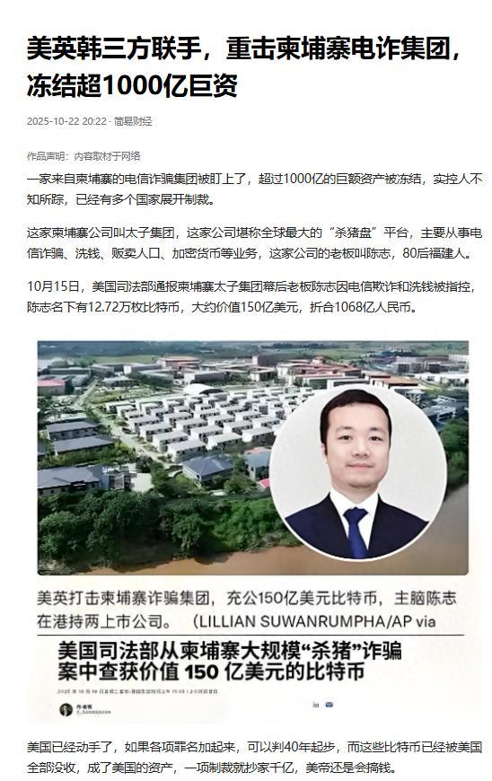 杀了个韩国人,骗了过去两个英国人,结果捅了马蜂窝,美英韩出手,电信园区解散,众喽啰树倒猢狲散,陈志仓皇出逃,下落不明(也许被美抓获),美没收约有150亿美元。 这事儿说白了,就是不作不死,陈志这帮人把电信诈骗玩得太出格,以为跨国作案就能逍遥法外,没想到直接捅了三国的马蜂窝。 这个80后福建人靠着柬埔寨太子集团的壳子,表面上搞房地产、开银行、建赌场,把自己包装成正经企业家,背地里却在柬埔寨偷偷建了10个电诈园区,把这里变成了专门坑蒙拐骗的“灰色王国”。 他大概觉得躲在东南亚就能天高皇帝远,跨国作案的幌子能遮住所有猫腻,却没料到杀韩国人、骗英国人的操作,直接把美英韩三国的底线全踩了一遍。 先说说那桩惹恼韩国的祸事,这帮人连同胞都骗,更别说外国人了。 有个20多岁的韩国小伙子,就被所谓的“同胞”以高薪工作诱骗到柬埔寨,刚落地通讯工具就被没收,家人紧接着接到勒索电话,开口就要五千万韩元,还放话“不许报警否则撕票”。 更狠的是,园区里的监工都有“不打死就行”的体罚标准,这小伙子最终没能活着回家,这种草菅人命的操作直接戳了韩国的痛处,也为后来的联合打击埋下了伏笔。 而英国那边本就被诈骗搅得头疼,2024年平均每天要发生7000多起远程盗刷案,全年损失高达18亿英镑,陈志团伙自然没放过这块“肥肉”,用精心包装的“杀猪盘”把不少英国人骗得血本无归,这等于在英国警方的眼皮子底下抢钱,不被盯上才怪。 最嚣张的是,陈志把诈骗做成了流水线作业,在园区里搞起了“手机农场”,光两个设施就摆着1250部手机,控制着76000个社交媒体账号,专门用情感套路诱导受害者投资。 他曾高调吹嘘每天能赚3000万美元,这些钱靠着太子银行洗白后,全砸在了私人飞机、豪华游艇和毕加索画作上,活脱脱把犯罪所得过成了豪门生活。 他大概觉得花钱打点就能稳住局面,却忘了美国早就对东南亚电诈忍无可忍——2024年美国人在这类骗局里损失了至少100亿美元,比前一年暴涨66%,陈志这150亿美元的非法所得里,不知道掺了多少美国人的血汗钱。 这下算是彻底捅了马蜂窝,美英韩直接联手亮剑。 美国司法部一出手就是王炸,盯上了陈志藏在25个私人钱包里的127271枚比特币,二话不说全部没收,按当时市价算正好150亿美元,创下了美国史上最大规模的资产罚没纪录。 英国也紧跟着动手,冻结了他在伦敦市中心的19处房产,光一栋办公楼就值近1亿英镑,相当于直接抄了他在欧洲的“豪宅仓库”。 韩国这边更不含糊,5家银行直接冻结了他4.5亿人民币的资产,虽然是银行自发行动,却实打实掐断了他在韩国的资金链,这波操作堪称“美国吃肉、英国喝汤、韩国啃骨头”,把陈志的钱袋子掏了个空。 更有意思的是,这波打击直接打垮了陈志的整个帝国。 他苦心经营的太子银行因为被制裁引发挤兑,只能暂停交易,10个电诈园区里的喽啰们见老板跑了、资金冻了,立马树倒猢狲散,曾经塞满手机和电脑的办公室瞬间人去楼空,只留下散落的诈骗剧本。 而始作俑者陈志早就没了往日的嚣张,带着英国和柬埔寨双国籍仓皇出逃,至今下落不明,有人说他藏在了第三国,也有人猜他已经被美国盯上,毕竟40年的牢狱之灾正等着他,这下算是把自己从“百亿富豪”玩成了“国际通缉犯”。 说到底,陈志就是把聪明用错了地方,以为跨境作案+花钱打点就能逍遥法外,却忘了诈骗这事儿越做大越扎眼,杀韩国人、骗英国人的操作更是把三国的执法力量全引了过来。 150亿美元的赃款没捂热,园区没了,手下散了,自己还成了丧家之犬,这波“不作不死”的操作,算是给所有跨国诈骗团伙当了个反面教材——出来混,迟早要还的,尤其是惹了不该惹的主儿,翻车只是早晚的事。