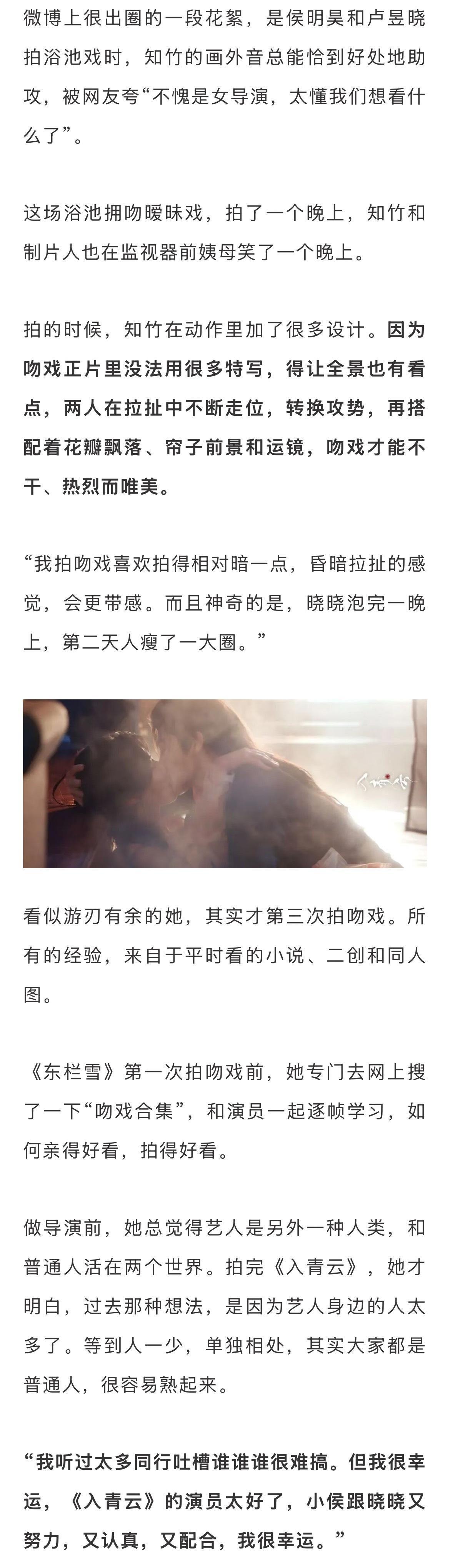 谈及出圈的侯明昊、卢昱晓浴池吻戏花絮,知竹透露这场戏拍了一个晚上,她和制片人也在监视器前姨母笑了一个晚上。拍的时候,知竹在动作里加了很多设计。“我拍吻戏喜欢拍得相对暗一点,昏暗拉扯的感觉,会更带感。而且神奇的是,晓晓泡完一晚上,第二天人瘦了一大圈。”