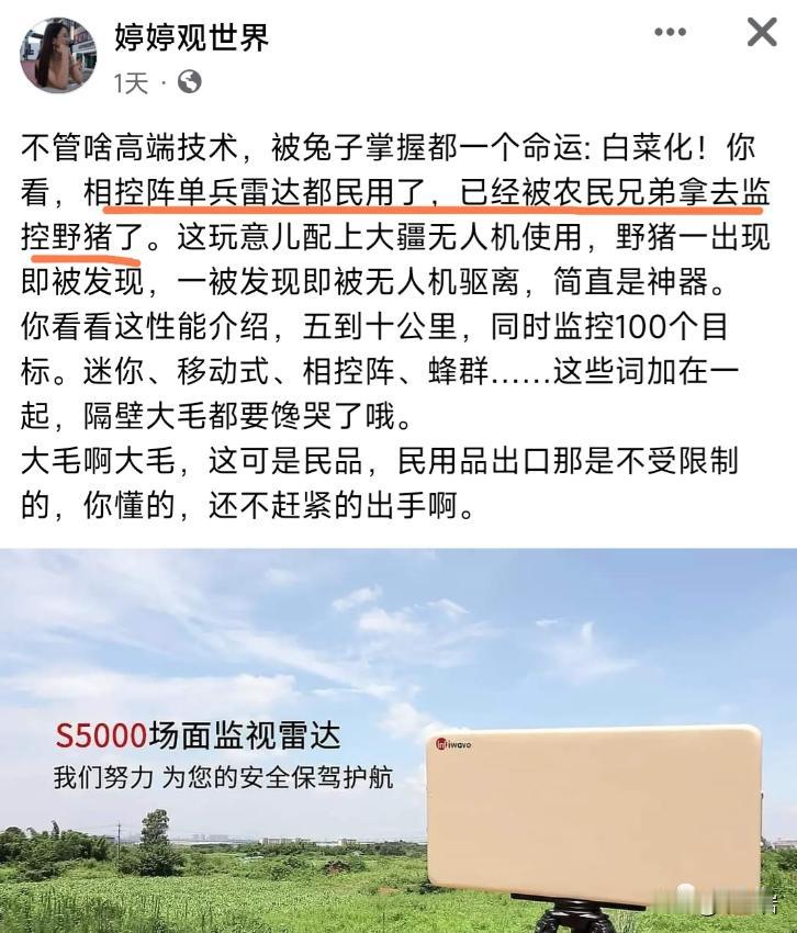 俄乌战争的微缩版很可能在中国的养猪场上演……[捂脸][捂脸][捂脸] 新闻报道就怕连起来看。再想一想就可能细思极恐了。 比如最近好多地方突然发生用无人机投射弩箭杀害牲畜事件,造成许多养猪场,养牛场的不小损失,你要人家怎么防范呢? 嗯,咱们这边以前有对付野猪的相控阵雷达,民用版的…… 所以有必要把这玩意儿请来去对付无人机。而且你也应该能买得来,因为它是民用品啊,不属于军火,不受管控。 还有还有,咱们网上很多网友已经造出了打蚊子的微型激光枪,等比放大,尤其是功率上放大吧,就可以造出微型激光炮,打掉无人机应该可行。 更重要的是,按照现行的中华人民共和国枪支管理法,这玩意儿不算枪,所以也合法…… 最后是弄1套电脑系统,让那个相控阵雷达,和这些激光炮能进行联动,虽然我不知道目前市场上有没有类似的产品,但是考虑到中国有那么多码农,市场经济之下,有需求肯定有动力,这个玩意开发起来难度一定也不大…… 那么,下一步的场景你可以设想一下,无人机,甚至是蜂群式的朝着某个养猪场使劲,该养猪场果断的动用了相控阵雷达和激光炮予以防御还击…… 俄乌双方,他们要是有这水平,只要一方有这水平,战争就断然不会打的如此复古了……[笑哭][笑哭][笑哭][捂脸][捂脸][捂脸]