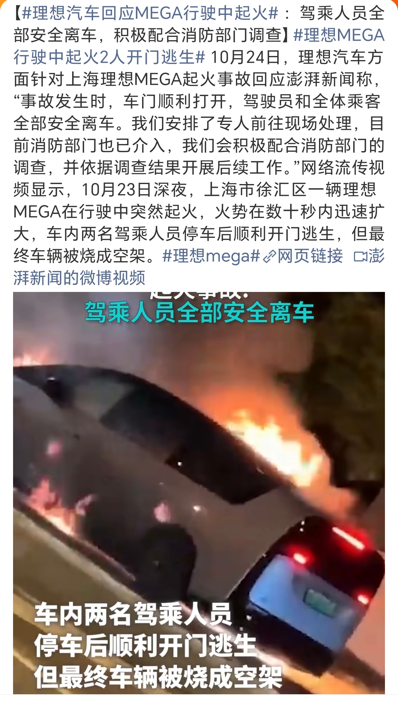 理想汽车回应MEGA行驶中起火又看了一次其他路人拍的视频,动静整的确实让人害怕,好在确实没有人员受伤。不过这新闻里这句:车门顺利打开,怎么觉得是意有所指呢……