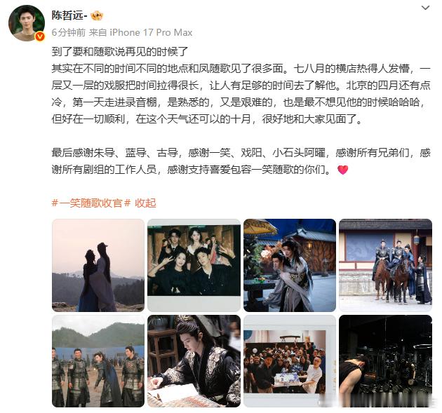 陈哲远一笑随歌收官长文陈哲远收官发文 陈哲远发《一笑随歌》收官长文,回顾横店七八月、北京四月创作时光,致谢剧组与粉丝。