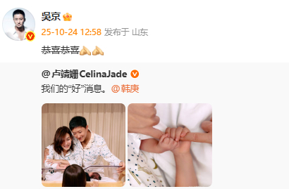 吴京祝贺韩庚卢靖姗二胎出生吴京恭喜韩庚卢靖姗二胎出生 恭喜恭喜[作揖][作揖]