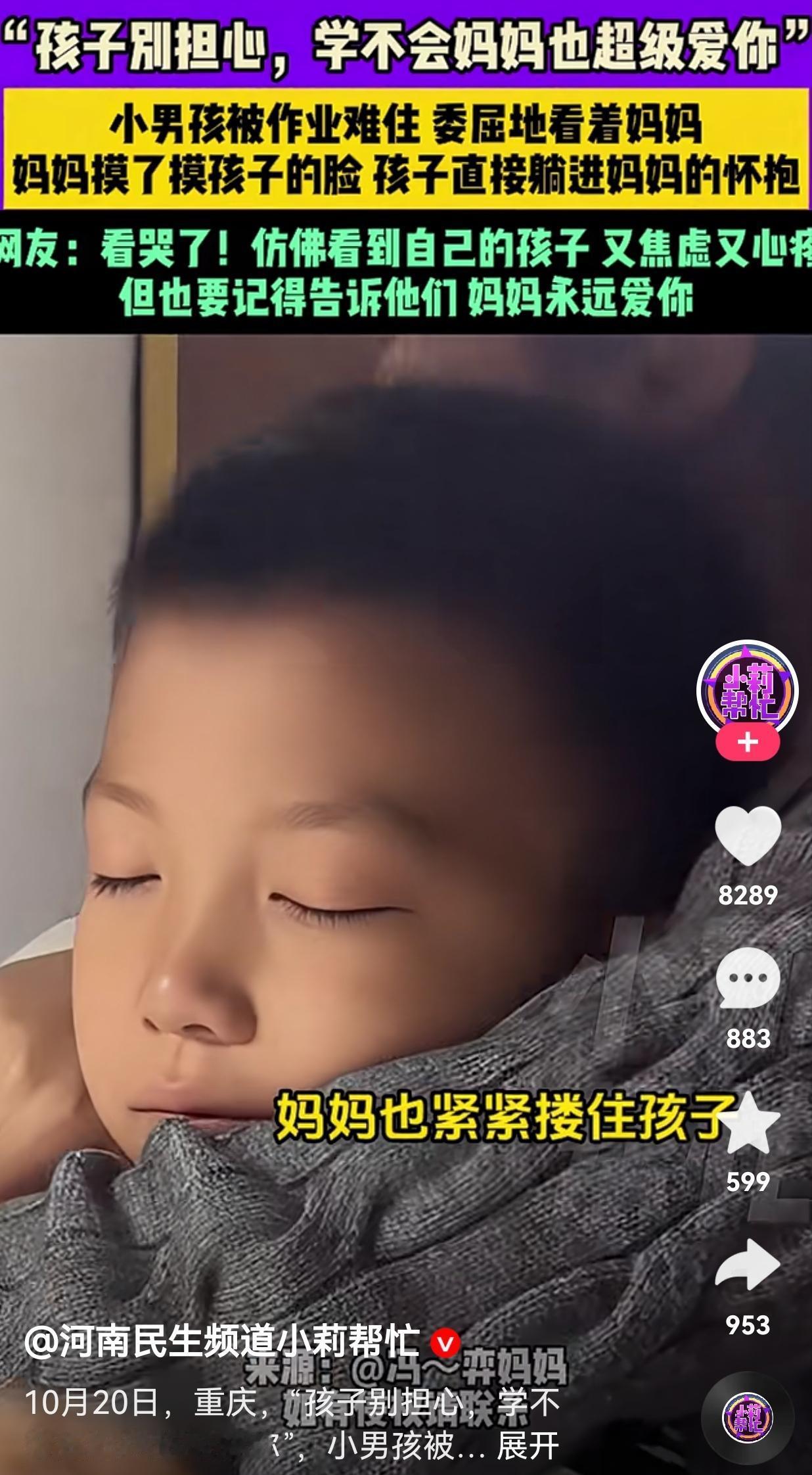 这才是正确的教育方式!孩子写作业,被作业难住了,妈妈看到孩子难为坏了,赶紧上前辅导孩子做作业。 妈妈教了好几遍,孩子可能没有开窍,就是教不会。 这位妈妈的做法,真的是让人称赞,这才是正确的做法! 这位妈妈面对无助的孩子,没有坏脾气,责怪孩子太笨了,更没有怒不可遏,对孩子大吼大叫! 只见她耐心地安抚孩子受伤的情绪,努力让孩子情绪稳定下来。 而孩子委屈巴巴地看着妈妈,看到妈妈摸了摸自己的小脸蛋,孩子直接躺进妈妈的怀抱。 为了给孩子足够的安全感,妈妈一把将孩子紧紧搂住。 这个时候,孩子感受到妈妈的爱意十足,只见孩子紧闭双眼,委屈地挤出眼泪。 看得出来,孩子也想尽自己最大的努力写好作业,可是,写好作业这件事情,已经超出了男孩的极限。 网友看到后评论说,看到这一幕真的看哭了!仿佛看到了自己的孩子,又焦虑又心疼。但是,也要告诉孩子,无论如何妈妈都永远爱你。 还有的网友说,明明孩子刚出生的时候,家长唯一的愿望就是希望孩子健康快乐。但是,随着孩子渐渐地成长,这份快乐好像变质了,怎么样也快乐不起来了。 学习不是你的全部,学习好固然重要,但是,学习不好又能如何呢?只要孩子努力了,其他的就听从命运的安排吧! 这位母亲的做法真的治愈了孩子的童年,尽管学习压力很大,很多时候,孩子可能学不进去,也学不会。 但是,母亲知道孩子的处境,设身处地为孩子着想,不会过分苛责孩子。虽然孩子在学校压力大,但是,在家里能得到救赎。这样一来,孩子的心理就不会出现大问题。 如果你的孩子尽力了,也是学不会,不妨学习一下这位母亲的做法。大家觉得呢?欢迎大家评论区讨论留言。