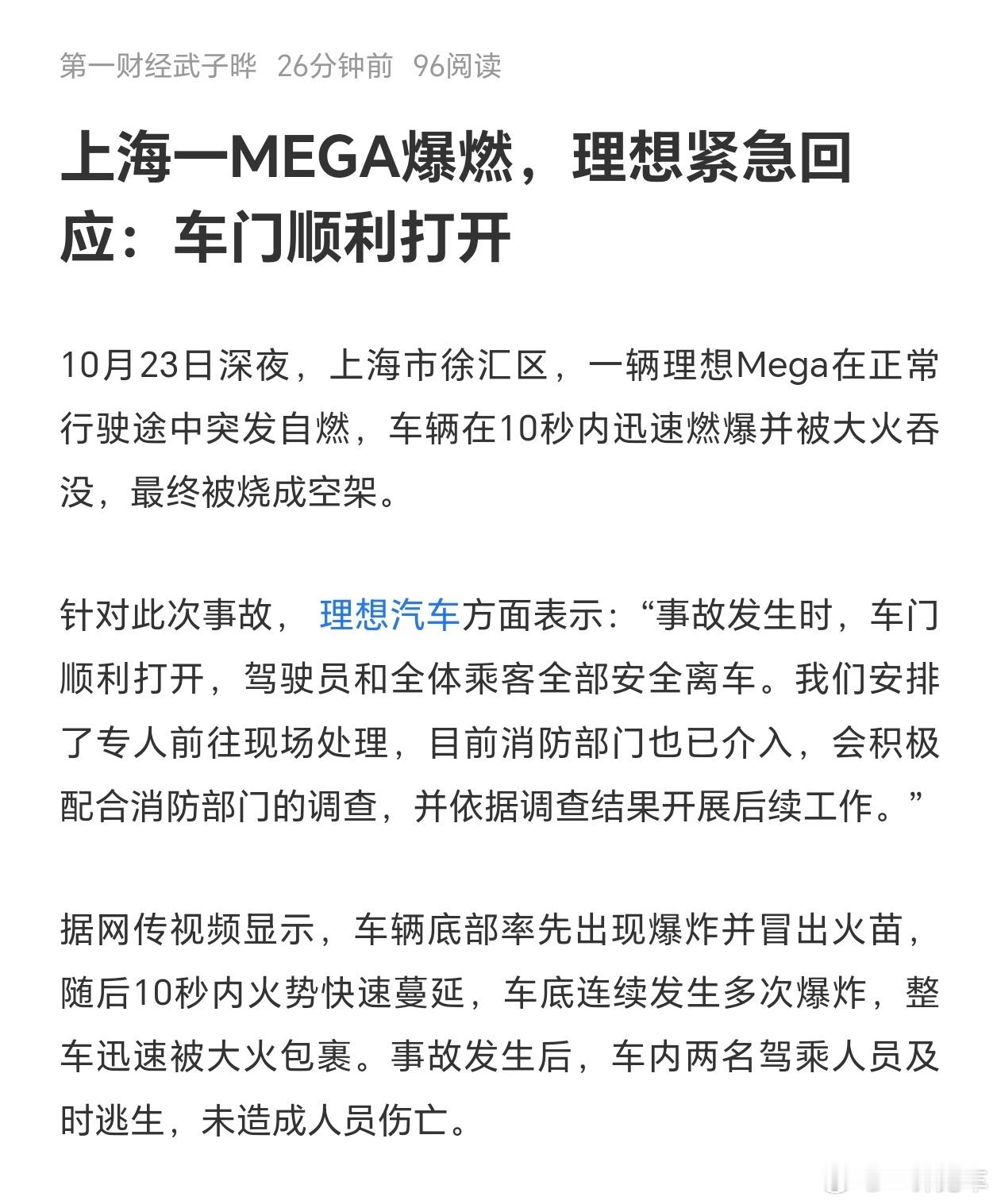 理想mega目前的消息就是车门正常打开,驾驶员和乘客已经离车,等后续调查吧[思考]