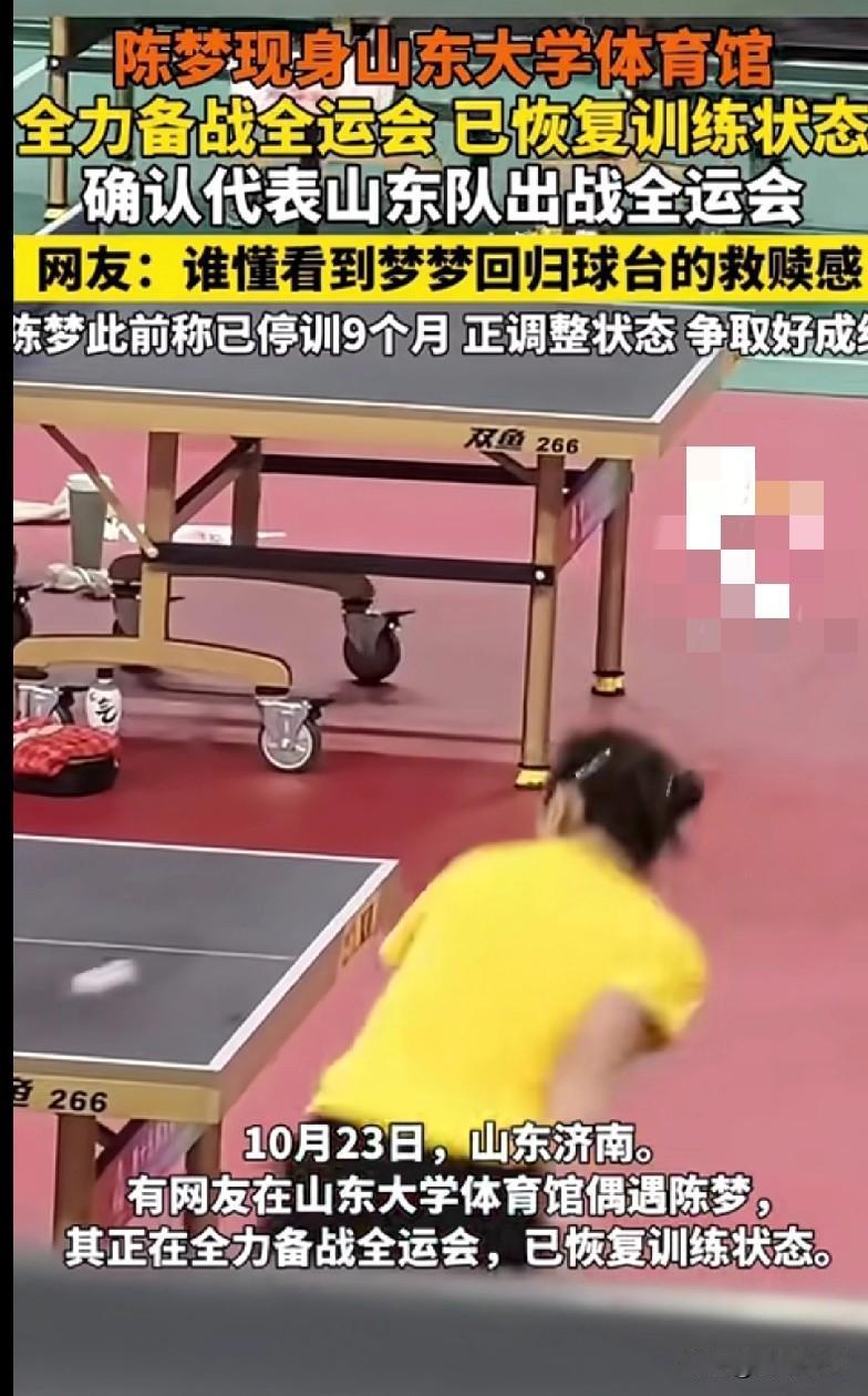 家人们谁懂啊!昨天在山东大学体育馆偶遇到陈梦了!咱山东的乒乓一姐穿着亮黄色运动服,在球台边哐哐练球,那状态绝了! 要知道她之前停训9个月呢,现在为了全运会直接杀回训练场,还确认代表山东队出战!咱就说这回归球台的画面,是不是有种妥妥的“救赎感”? 看她在球桌上灵活走位、大力扣杀,那股子拼劲,真不愧是咱山东的骄傲!期待她在全运会上再创佳绩,梦梦冲鸭!