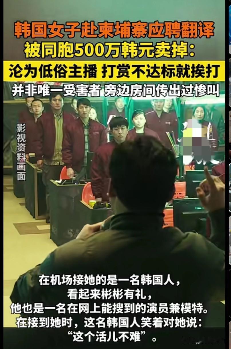 家人们!这事儿看完我鸡皮疙瘩都起来了!韩国一30岁的金敏荷(化名)想去柬埔寨应聘翻译,结果被自己同胞以500万韩元(差不多2.6万人民币)给卖了!之后被迫当低俗主播,打赏没达到要求就挨打,而且她还不是唯一的受害者,旁边房间都传出过惨叫…这哪是找工作,简直是往火坑里跳啊! 咱可得警醒着点,境外那些所谓的“高薪工作”陷阱太多了,尤其是这种跨国家的招聘,背后指不定藏着多少幺蛾子。找工作一定要擦亮眼睛,这种天上掉馅饼的事儿,十有八九是把人往绝路上引的陷阱!