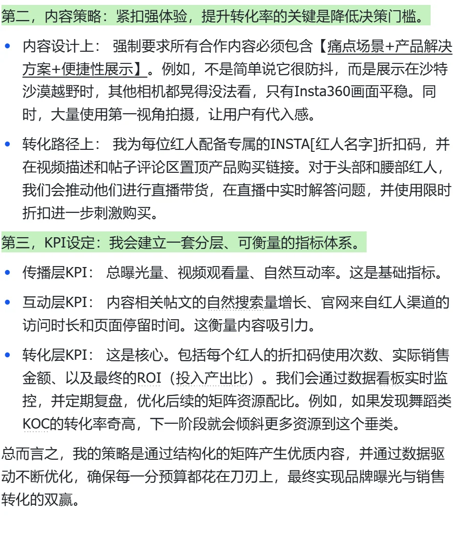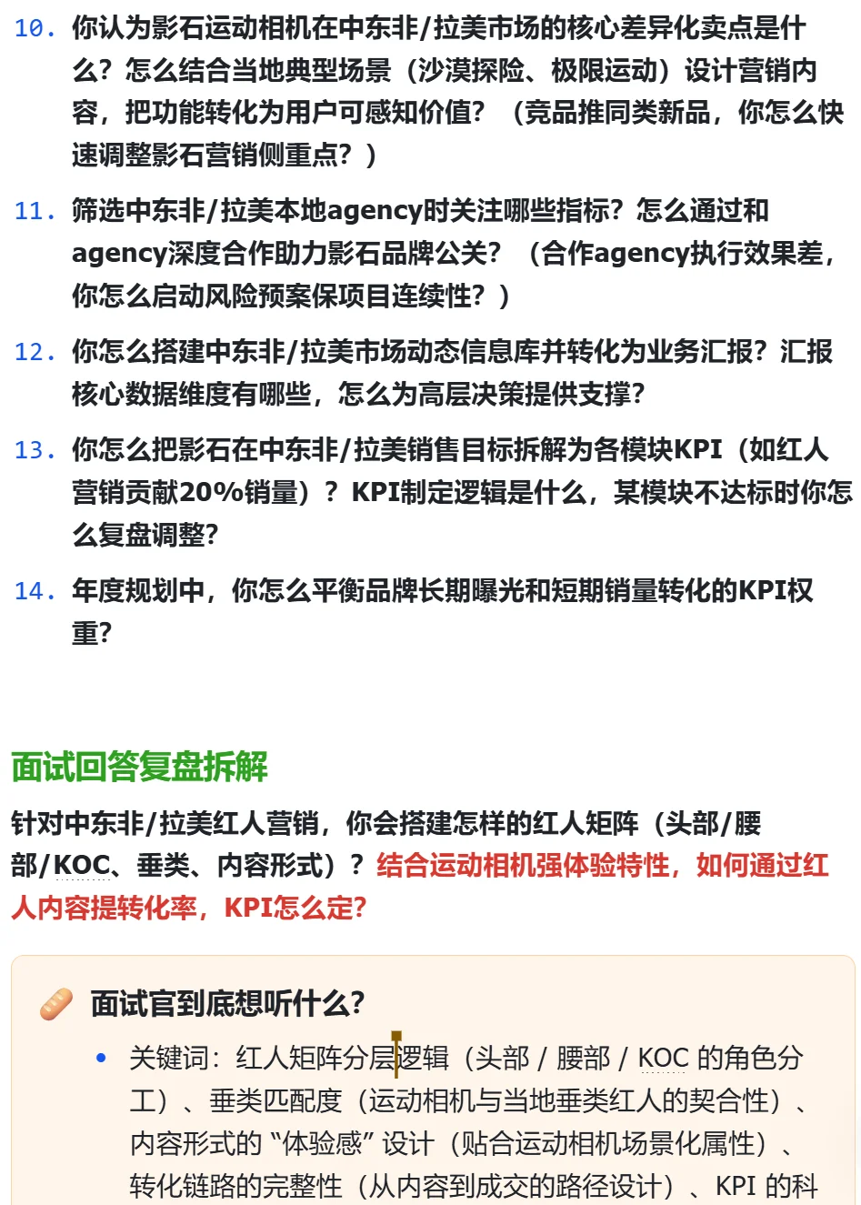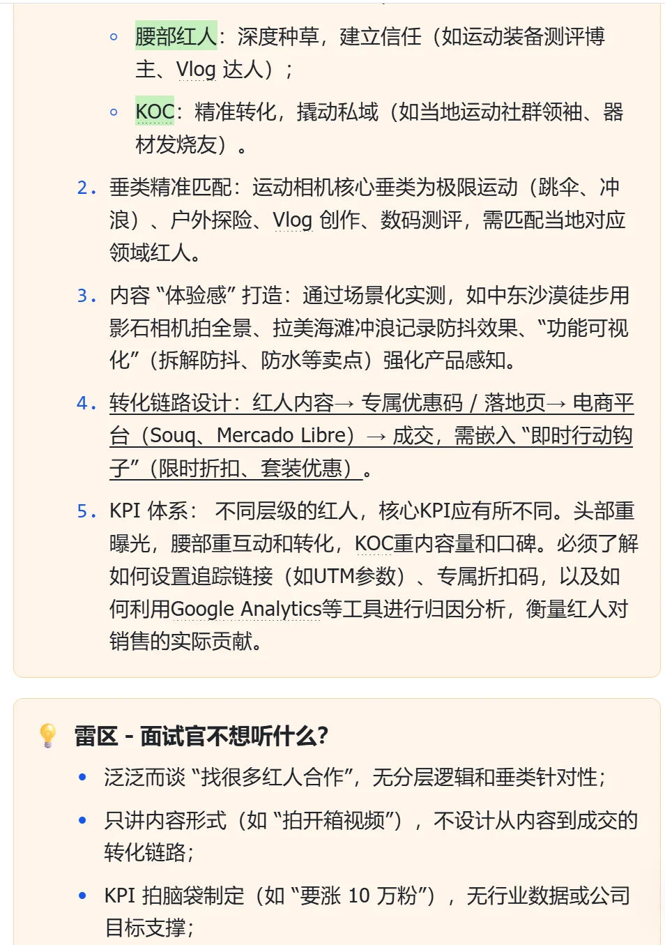 3. 针对中东非/拉美红人营销,你会搭建怎样的红人矩阵(头部/腰部/KOC、垂类、内容形式)?结合运动相机强体验特性,如何通过红人内容提转化率,KPI怎么定?