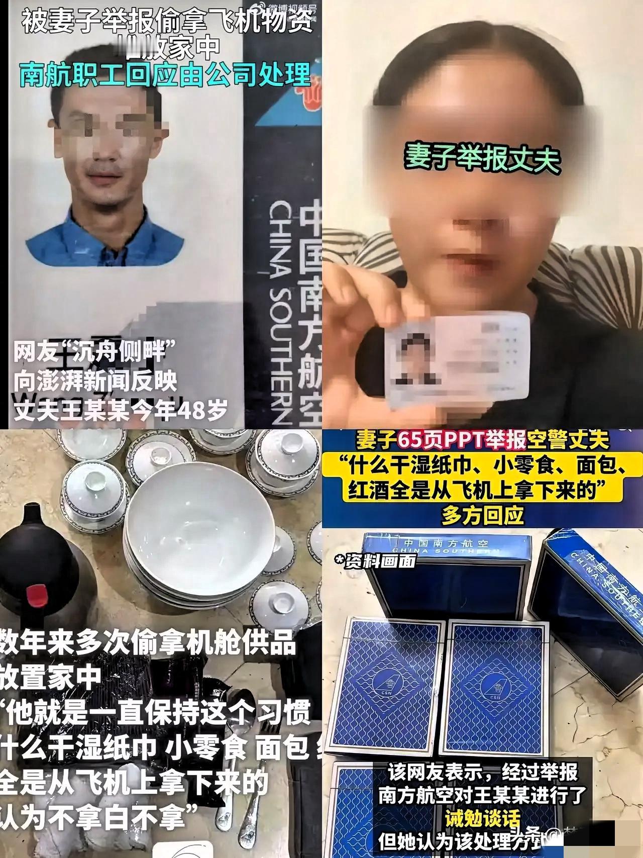 有时真得信,最伤你的人,偏偏是睡在枕边的那个! 南航空警48岁正安稳过日子,老婆为了离婚,居然熬出65页PPT举报他,说他侵吞公司财物——说白了就是把机上用剩的一次性拖鞋、小面包、湿纸巾、红酒带回家。 这哪儿是侵吞啊?分明是勤俭持家到骨子里!这些东西机上用不上也是浪费,顺手带回来家用,多会过日子的心思? 可他老婆倒好,一边翘着腿用着这些“战利品”,一边反手把人往坑里推,这心眼子也太黑了! 我就特待见会过日子的人,我老公出差,酒店的一次性梳子、咖啡包、纸巾也会带回来,我从来没觉得掉价,反而觉得他心里装着家,变废为宝多好。 你们说,是这男的太实在,还是这女的为了离婚脸都不要了? 换作你们,会觉得老公带这些小东西回家是会过还是掉价?