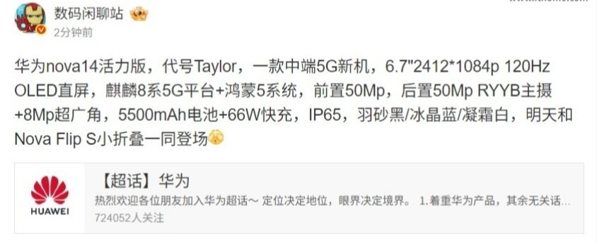 华为 nova 14 活力版代号 Taylor,是一款中端 5G 新机,搭载 6.7 英寸 2412*1084p 120Hz OLED 直屏,麒麟 8 系 5G 平台 + 鸿蒙 5 系统,前置 50Mp,后置 50Mp RYYB 主摄 + 8Mp 超广角,5500mAh 电池 + 66W 快充,IP65,羽砂黑 / 冰晶蓝 / 凝霜白。