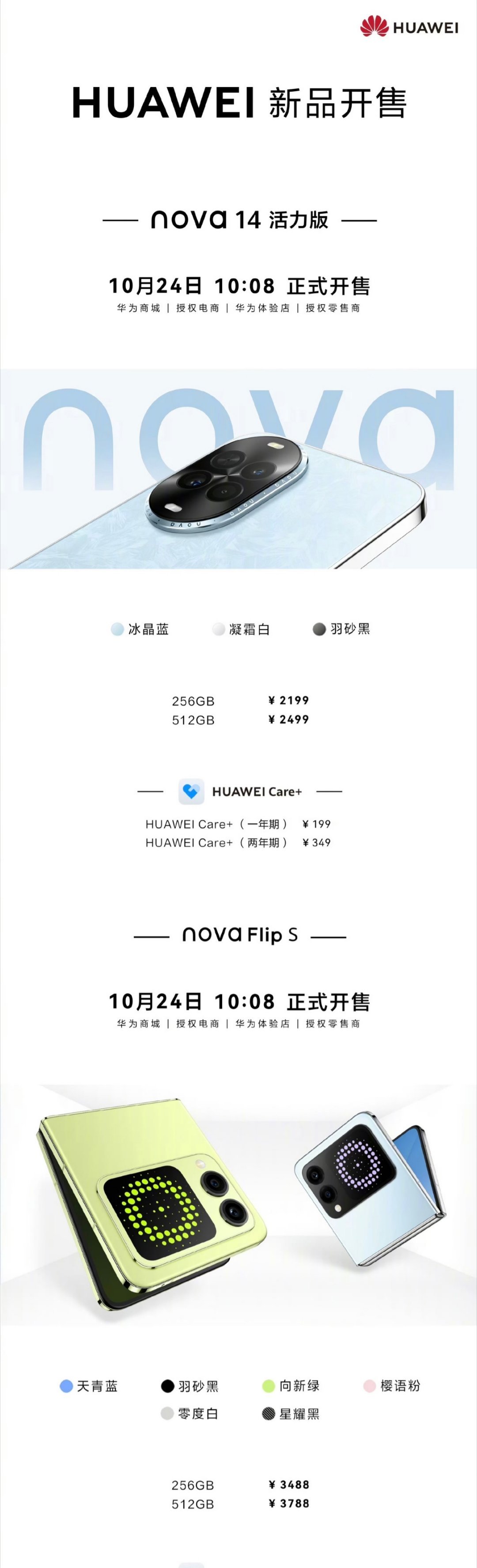 据华为终端官微,华为 nova 14 活力版(直板手机)和 nova Flip S (小折叠手机)将于今天上午 10 时 08 分开启首销。