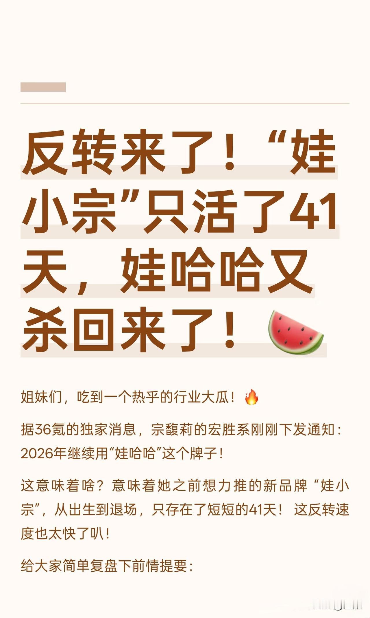 没看见有卖娃小宗的水,哪里能买到,可以去买几瓶,有收藏价值,相当于娃哈哈的错版水……据南方都市报援引36氪消息,娃哈哈内部近期出现品牌战略的重大反转:宗馥莉所控股的宏胜系,在推出新品牌“娃小宗”仅41天后,于今日傍晚下发通知,明确2026年将继续使用“娃哈哈”品牌。