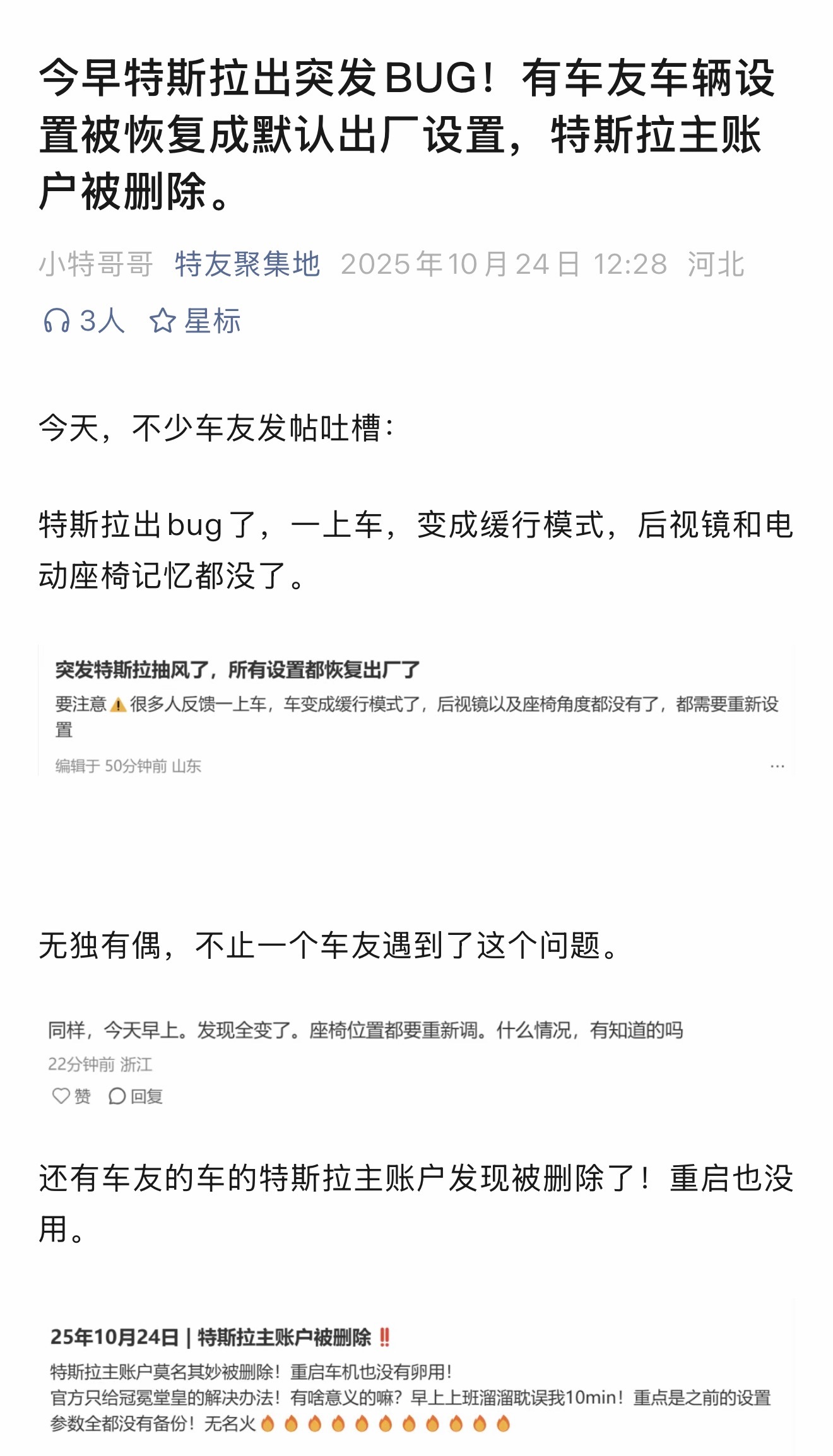 特斯拉出突发BUG!有车友车辆设置被恢复成默认出厂设置,特斯拉主账户被删除。