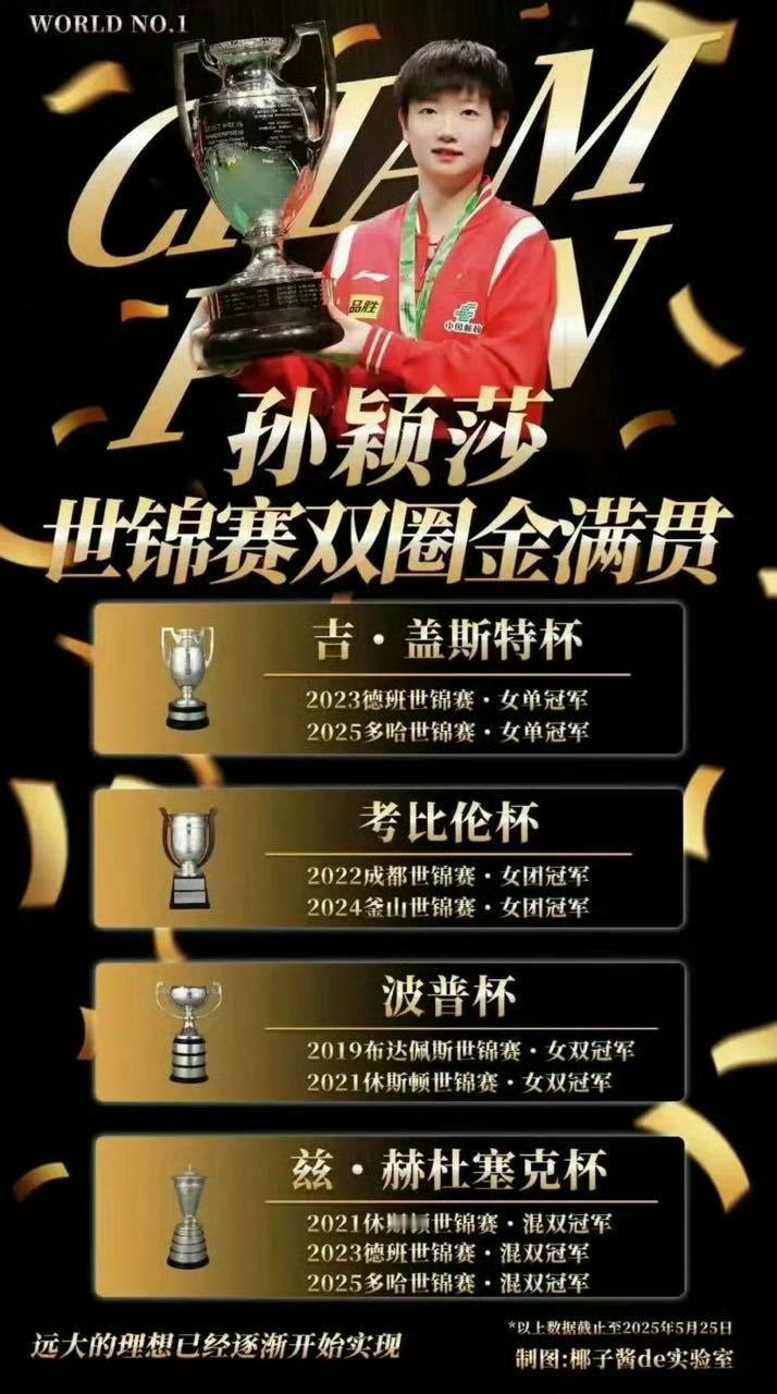 现已经手握四座三大赛单打世冠现役唯一世乒赛双圈金满贯孙颖莎太牛了!