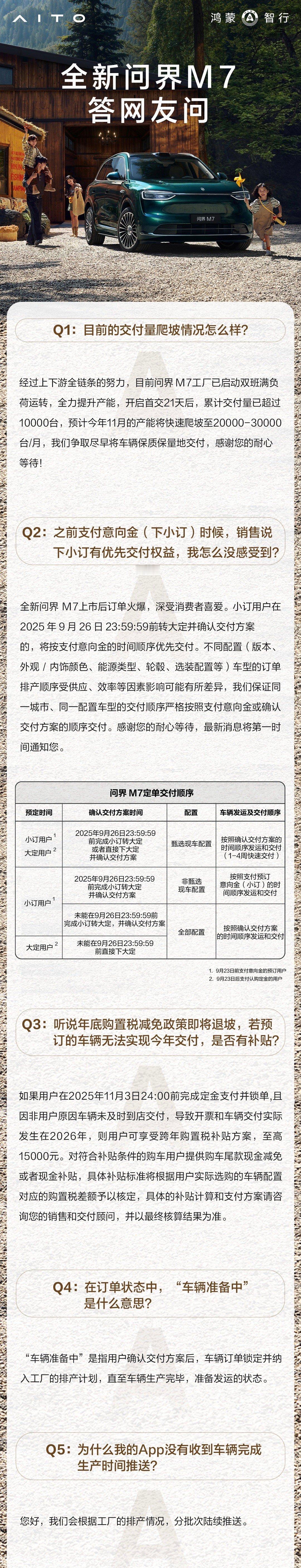 AITO汽车公布了全新问界M7在产能、交付及用户权益方面的最新信息。
