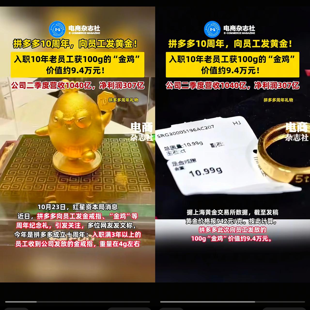马云沉默了 马化腾也无语了! 万万没想到,拼多多居然卷出了新高度 给老员工发黄金,这波操作太实在!10年老员工送100克金鸡,值差不多10万;5年的给11克金戒指,也有1万;哪怕满3年,都有4克刻名金戒,4000块到手。员工晒出来的时候,全是“能干到退休”的感慨! 其实这事儿根本不是跟风发福利,而是拼多多摸准了现在打工人的心思:工资不涨、裁员不断的当下,真金白银比画饼管用多了,既留了人,又暖了心,比啥企业文化口号都强! 你觉得这种“黄金留人权”,会不会让其他大厂也跟着学?
