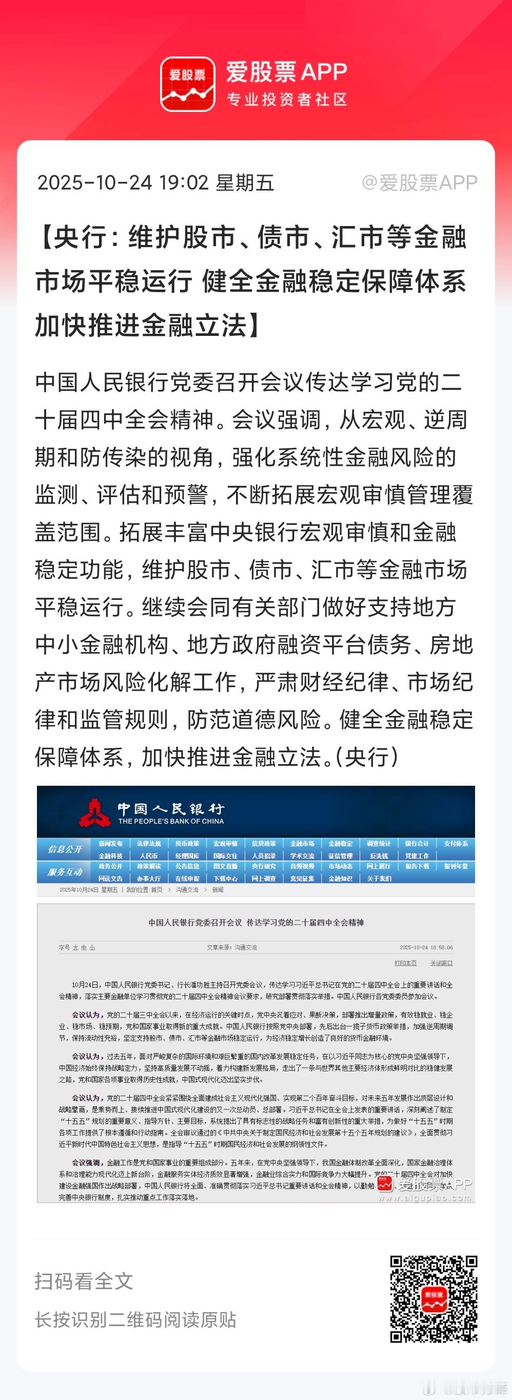 盘后央行又来了两个利好:第一、召开会议传达学习党的二十届四中全会精神,强调维护股