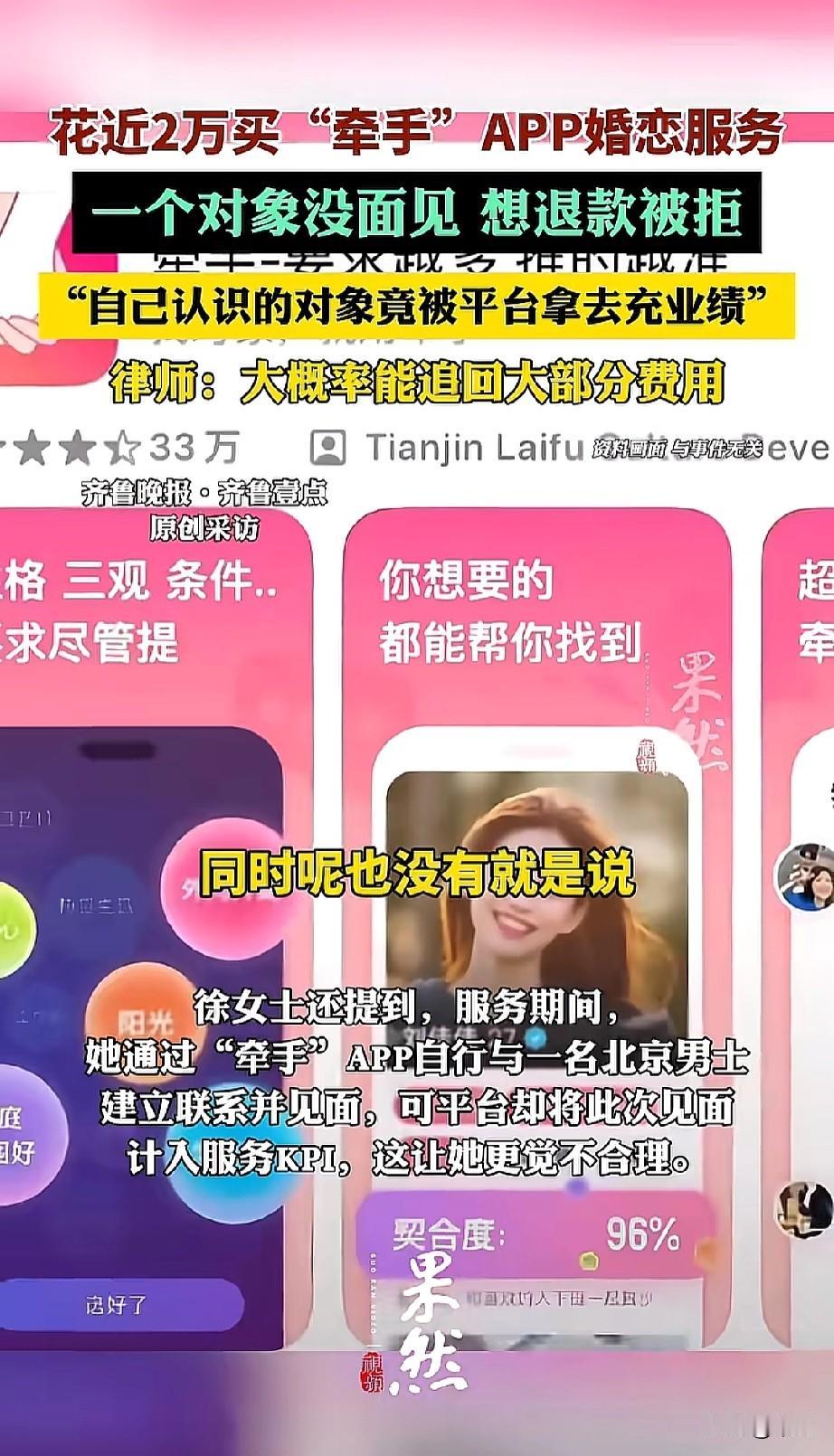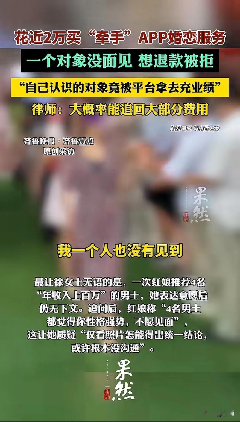 有人花近2万买牵手APP最高级婚恋服务,平台承诺每月推10个优质男士,到期还能终身被动推荐。 实际服务差太多,红娘推荐的人没后续,不安排见面也不给联系方式。对接红娘还失联,换的新红娘不主动,甚至不推荐了。自己在APP找的人见面,还被算进平台服务KPI。 要退款时平台各种推脱。这不是个例,还有人被诱导付费后,推荐的人不符合要求,红娘离职,甚至推荐的是被硬劝来的人 。 这些平台就抓着单身人焦虑心理,用虚假承诺圈钱 ,合同也藏猫腻。希望能有明确监管细则,管管这些乱象。大家交钱前一定要多留个心眼,别让着急脱单的心情被当生意宰。