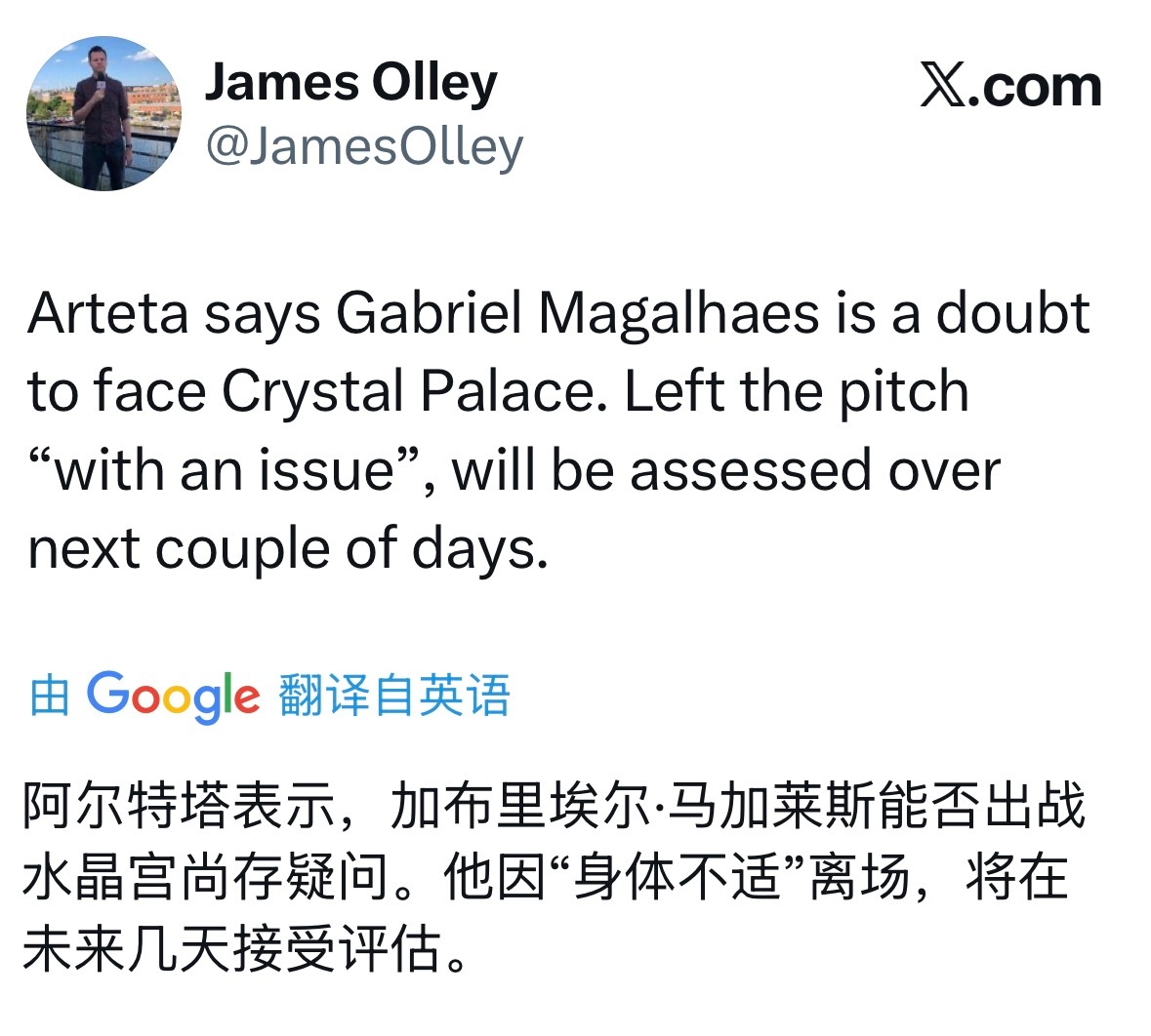 【赛前发布会】阿尔特塔:加布里埃尔出战成疑