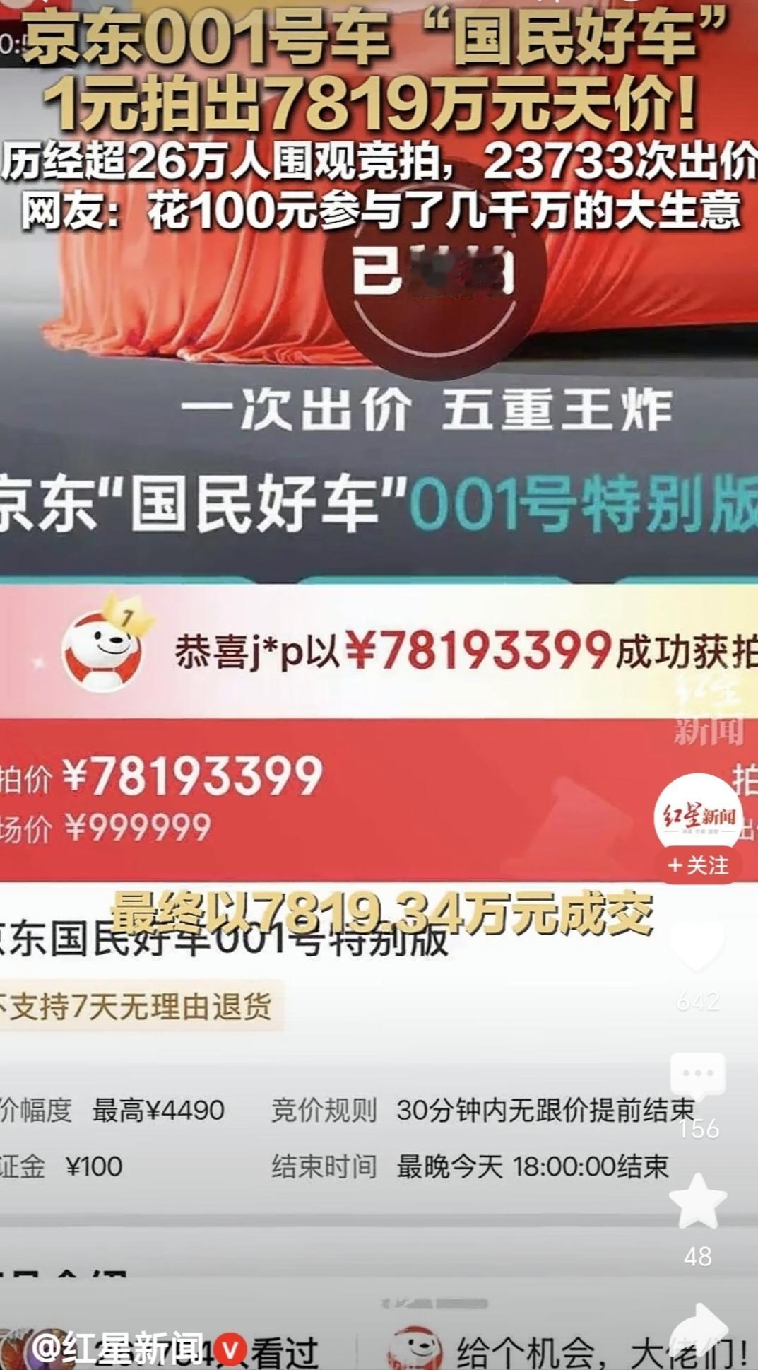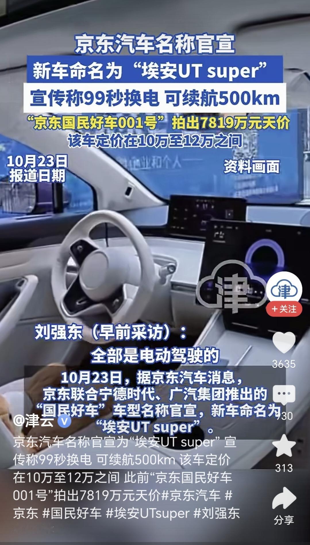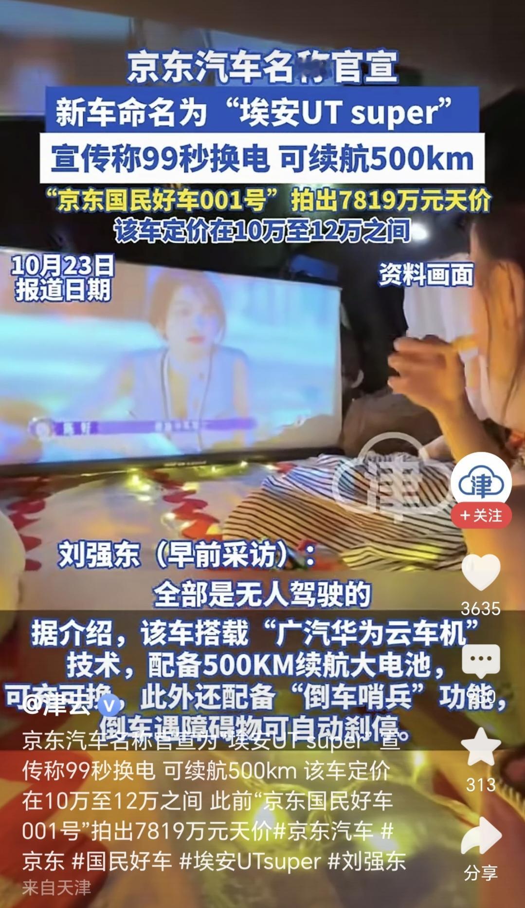 京东推出新车命名埃安UT super,以7819万元天价在京东拍卖平台成交 京东001号汽车(京东联合广汽、宁德时代推出的‘国民好车’特别版)于2025年10月22日以7819万元天价在京东拍卖平台成交,吸引超27万人围观并出价23733次,最终成交价达7819万元,溢价780倍。该车的价格也是非常亲民的,定价在10万到12万之间。 随着小米的雷军造出汽车后,京东的刘强东也紧随其后,推出了第一款京东汽车。 刘强东在此前表示,未来汽车一定会变成全部是电动驾驶的,全部是无人驾驶的,人坐在车上唯一的事情,就是娱乐买东西。 湖北武汉的萝卜快跑,让人们已经见识到了全自动驾驶技术已经成熟,并且广泛应用于日常。 这项技术让所有不会驾驶以及拿了驾照不敢上路的人,都能够购买并使用汽车。 不得不感慨,科技改变生活。购车人在汽车行驶在路上的通勤的时间里,可以做更多的事情,不用手握方向盘,集中注意力。 酒驾这个名词,也许会从交通法中消失。人们不会再因为开了车不能喝酒,而选择不喝酒或者找代驾。试想一下,酒类消费会增加,而代价这个职业将会消失。 朋友聚会,结婚宴请等等,不用再有顾虑,喝酒会影响汽车驾驶,想喝就喝。交警查酒驾的测酒精仪,也会派不上用场。 自动驾驶不愧为汽车领域的时代的一次变革,彻底改变了传统模式,真正让汽车可以走进千家万户。 消息图片来源于津云和红星新闻