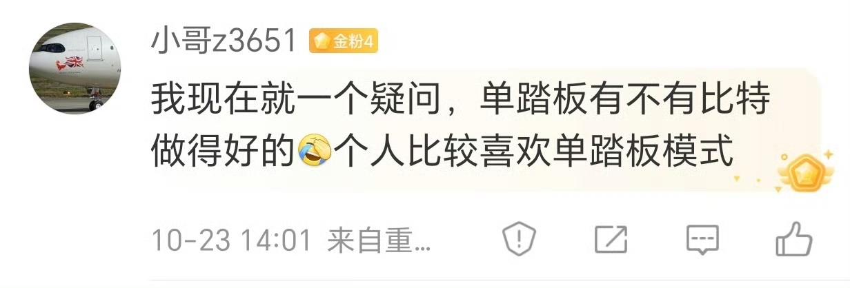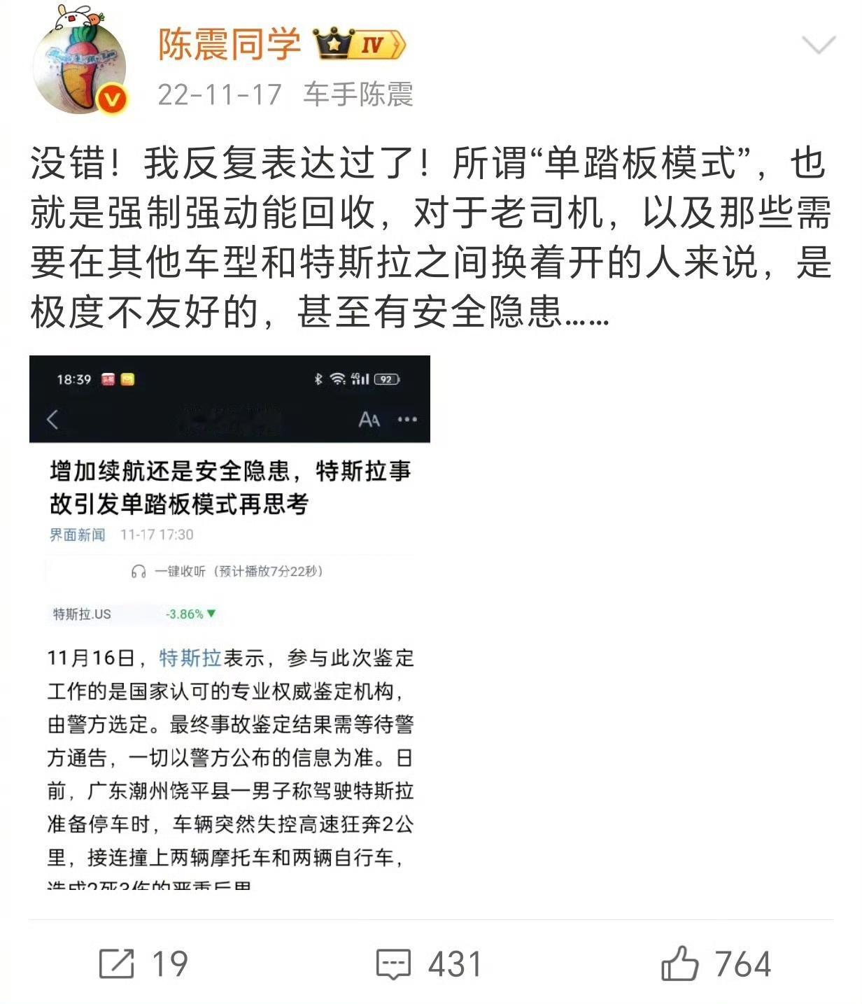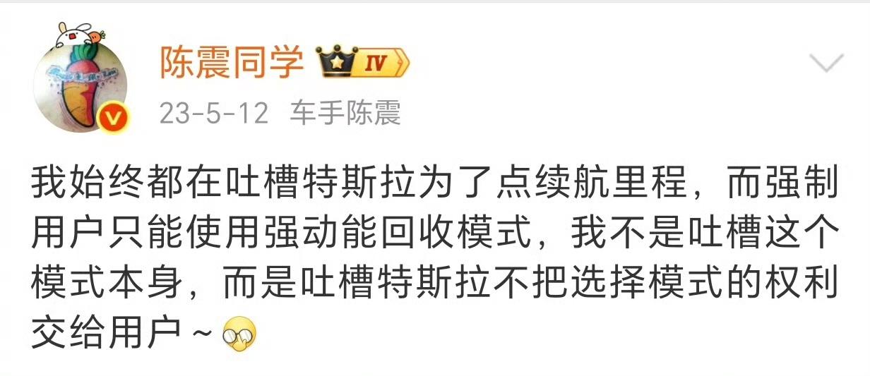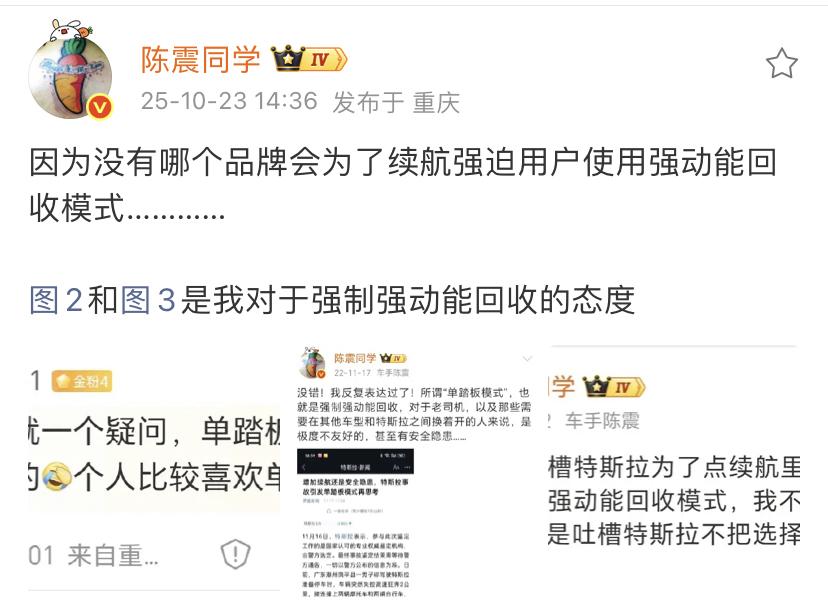 陈震:因为没有哪个品牌会为了续航强迫用户使用强动能回收模式………… 图2和图3是我对于强制强动能回收的态度 绝大多数开其他车型的老司机应该是用不惯强制回收动能模式的,因为很多人都喜欢预判式开车法,比如小编喜欢使用滑行,这个红绿灯和下一个红绿灯之间非常少一个刹车,基本上就划过去了。 其实强制回收模式也没有什么不好的,本质上是为了节能,但是特斯拉以前应该把这种选择权交给消费者。