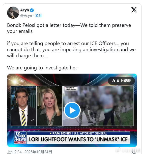 “如果你让人们去逮捕我们的移民与海关执法局官员、我们的联邦特工,你不能这样做,你是在妨碍调查,我们将对他们提出指控,”这位佛罗里达州的共和党人对福克斯新闻说。邦迪补充道:“佩洛西在那里说要阻碍他们的调查。你不能这样做,我们现在要调查她。”