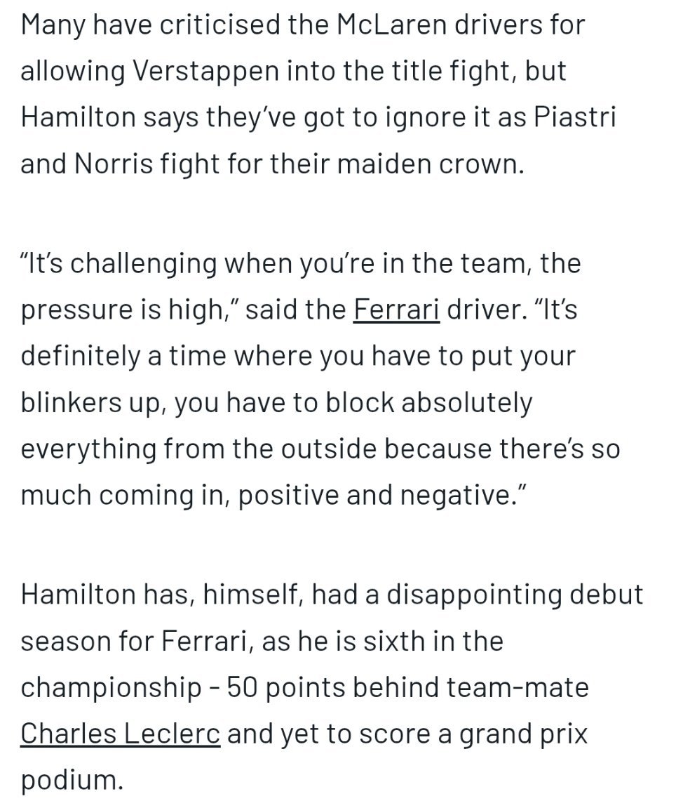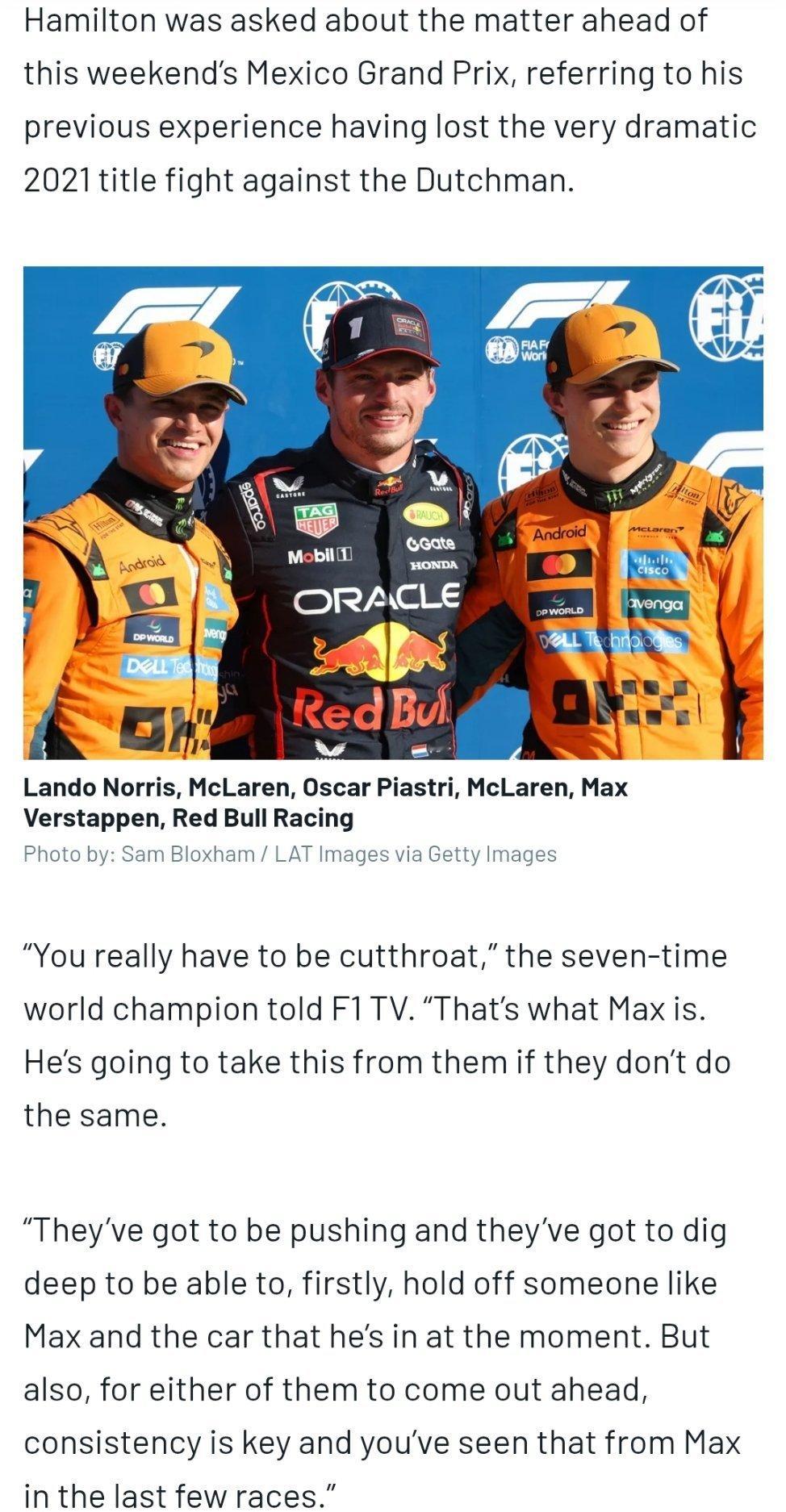 汉密尔顿谈到21年和维斯塔潘争夺的经历,并表示:皮亚斯特里和诺里斯必须全力以赴,变得更凶猛,才能在年度车手总冠军的争夺中去击败维斯塔潘。