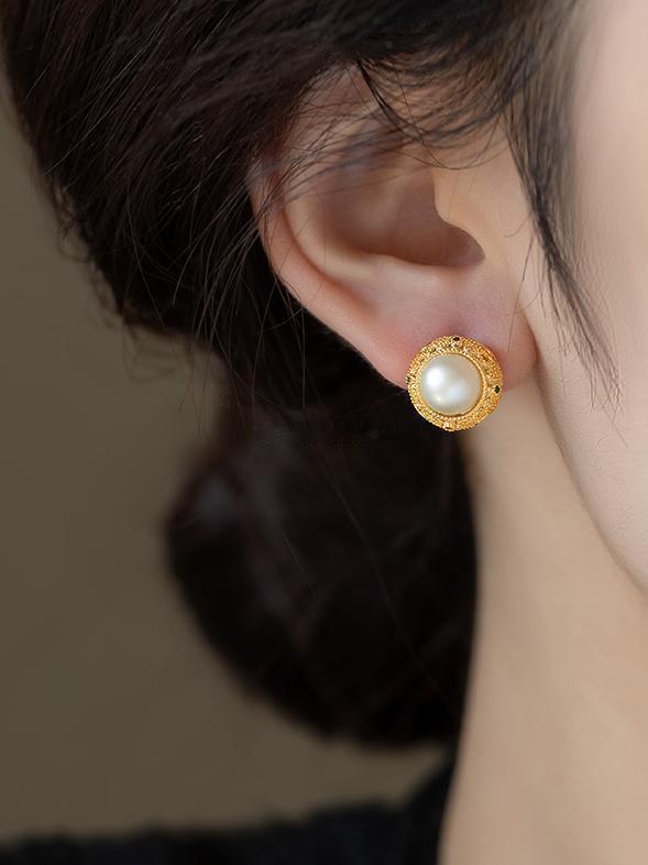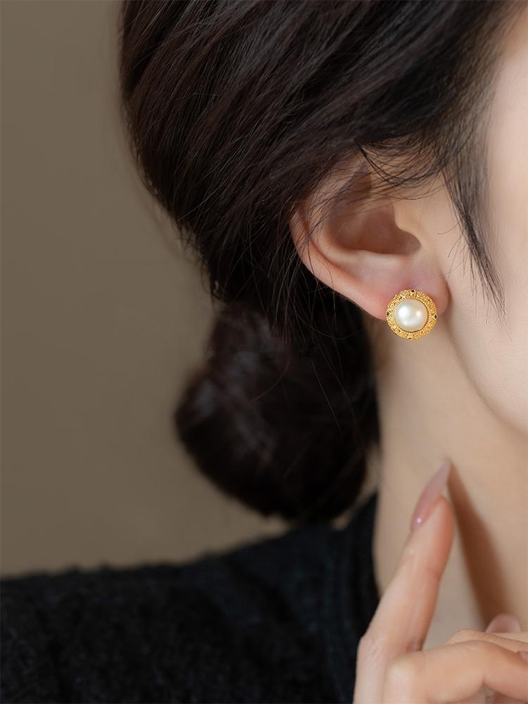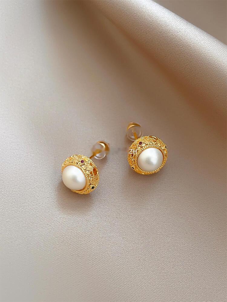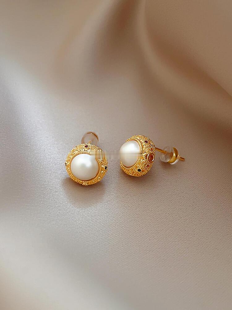 耳钉主体是复古金镂空设计,上面还点缀着细闪的彩色小钻,在光下细看特别有层次感,不会显得单调。中间的珍珠圆润饱满,光泽感绝了,不是那种廉价的塑料感,戴出去被夸了好多次“你这耳钉看起来就很有质感”!