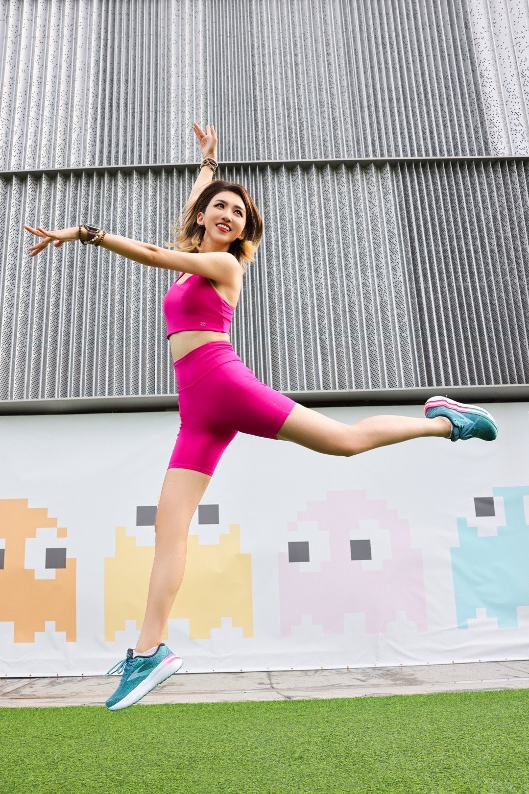 龚凡,玫红运动穿搭,健康美丽的主持人小姐姐