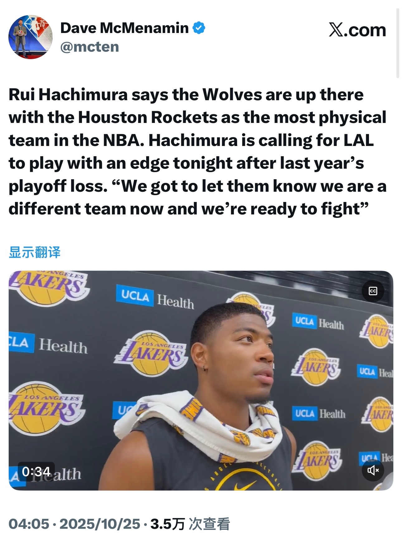 八村塁表示,森林狼和火箭一样,是联盟中身体对抗最激烈的球队之一。在去年季后赛失利后,八村塁呼吁球队今晚要带着锐气去比赛:“我们必须让他们知道,我们现在是一支不同的球队了,而且我们已经准备好去战斗了。”