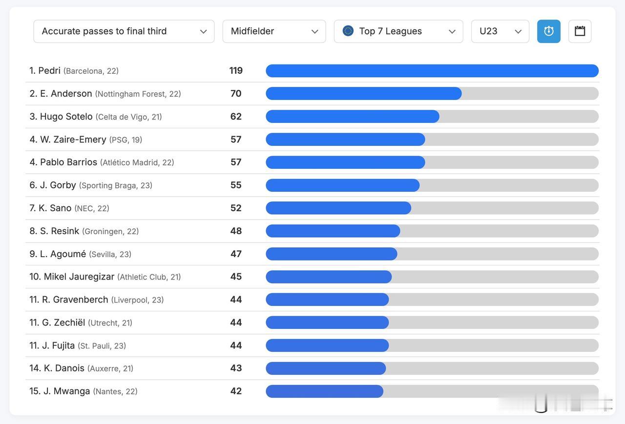 欧洲七大联赛U23中场球员向前场准确传球榜: 🥇 佩德里(巴塞罗那,22岁)——119次 🥈 安德森(诺丁汉森林,22岁)——70次 🥉 索特洛(塞尔塔维戈,21岁)——62次 🏅 埃梅里(巴黎圣日耳曼,19岁)——57次 🏅 巴里奥斯(马德里竞技,22岁)——57次 佩德里擅长肋部小范围穿透式传球,其119次传球数接近第二名两倍,展现巴萨进攻体系对其的绝对依赖 📊 数据来源:datamb.football
