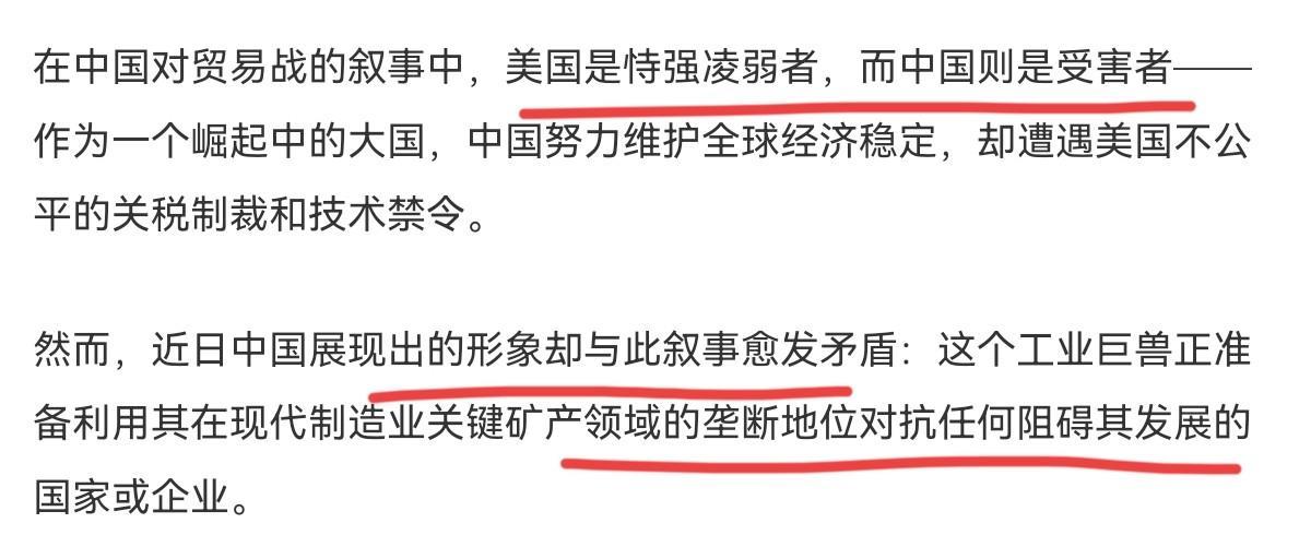 一掐就死,一放就活!美媒声称,中国现在已经成为了“霸凌者”!10月24日,纽约时报刊文表示,在中国对贸易战的叙事中,美国是恃强凌弱者,而中国则是受害者。然而,近日中国展现出的形象却愈发矛盾。因为,中国正准备利用其在现代制造业关键矿产领域的垄断地位对抗任何阻碍其发展的国家或企业。 美媒表示,多年来,中国一直谴责此类出口管制措施,如今却表示自己正效仿美国的做法。通过展现将稀土武器化的意愿,中国正在冒着被视为其经常指责的那种不负责任的霸权国家。稀土的管制,正在让中国越来越看起来成为一个“霸凌者”。很显然,美媒的这种论调,真是让人咋舌。 美媒把我们塑造成一个所谓的霸凌者,本意是什么呢?本意不就是要我们完全取消稀土管制政策吗?明明是国际通行惯例,美媒却声称我们霸凌,明明是我们对等反制,美媒则认为我们恃强凌弱。归根结底,美媒的逻辑就是我可以出手打你,你却不能还手。但凡还手,这就是霸凌,恃强凌弱。 美媒所作所为不就是要通过这种荒唐的舆论逻辑,对我们进行施压吗?当然,对付流氓国家,该打就打。但凡其开始讲道理了,这也就说明我们确实是把它打疼了。如果我们不拿出稀土反制,我们都不知道美国能够霸凌我们到何种程度?如果美国手里面有稀土这张牌,还不知道美国会嚣张到何种程度?很显然,现在规矩也该改一改了。一贯卡本人脖子的美国也该尝尝被卡脖子的滋味了。