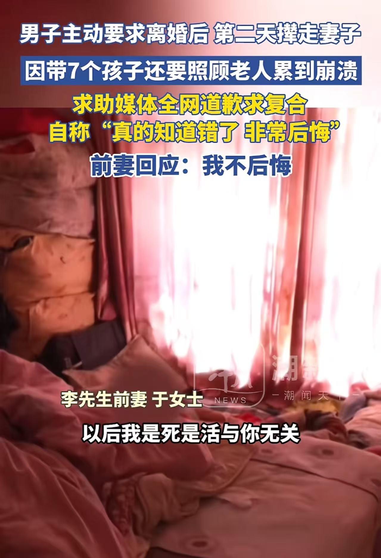 河南郑州,男子主动要求离婚后,因带7个孩子还要照顾老人累到崩溃,全网道歉“求复合”!男子:“老婆,我真的知道错了,非常后悔!”前妻回应:我不后悔!网友:他不是后悔了,他是没有免费保姆了! (来源:小莉帮忙) 李先生和妻子携手走过了15年的婚姻时光,一共育有7个孩子,两个儿子和五个闺女。 李先生一直觉得自己和妻子感情深厚,毕竟妻子愿意为他生下7个孩子,这份付出在他看来,就是爱的最好证明。 可到了6月份,命运的齿轮开始转动。李先生和朋友合伙开了一家饭店,之后便老是要求妻子辞去工作,到饭店帮忙。 妻子有自己的想法和规划,不愿意就这么放弃自己的事业,两人为此频繁争吵。 后来,饭店的生意每况愈下,最终难以为继。夫妻间的矛盾也随着饭店的倒闭愈发尖锐,在一次激烈的争吵后,李先生一气之下提出了离婚,第二天就无情地把妻子从家里撵了出去。 然而,离婚后的日子并没有李先生想象中那么轻松。孩子没了妈妈的陪伴,整天哭着要妈妈,家里没了女主人,变得冷冷清清。 父母年事已高,也需要人照顾,李先生既要当爹又要当妈,还要兼顾照顾老人,整个人忙得焦头烂额,根本无法安心工作,很快就被生活的重担压得几近崩溃。 这时候,李先生才意识到妻子对这个家的重要性,于是他找到调解员,希望借助调解的力量让妻子回来。 他满脸懊悔地说:“我现在一个人带着7个孩子,真的是有心无力,孩子们都哭着要妈妈,这个家没有她不行!” 调解员语重心长地问道:“你想求她回来,你自己要先理清楚,你是因为带不了这几个孩子,还是因为你心里对她还有一份情?” 李先生连忙回答:“我特别后悔,真的特别后悔,以前我俩特别恩爱的,她给我生了7个孩子,她也挺苦,说句实话,平时她只要是回家,想吃啥,我立马给她烧,现在一回家也见不到她人,心里很酸,我真的知道我错了!” 可当调解员联系上妻子时,妻子于女士的态度却十分坚决:“我跟你离婚,我不后悔离婚,以后我是死是活与你无关!” 原来,领了离婚证才两天,李先生就把她撵走。她搬到宿舍没两天,李先生竟跑到宿舍找她,还动手打她,污蔑她跟同事搂搂抱抱,说她外面有人。 调解员听后,也忍不住指责李先生不应该打人。李先生则满脸愧疚地解释:“我错了,她没找人我知道,我只是生气压力大了,喝酒了,发脾气了!” 调解员严肃地说:“她一个女人,她怎么去跟你对抗呀?你只有从内心深处认识到你自己的问题,才有资格去追求这段感情,让她重新回到你们的身边!” 李先生信誓旦旦地保证:“我保证把酒戒了,再也不喝酒了,不管能不能复合,我会尽我最大的努力把孩子照顾好,把家照顾好!” 此事引发了热议,有网友说,生七个你居然敢跟老婆离婚,如果是我睡觉都得睁着眼,怕对方跑! 也有网友说, 是因为7个孩子他找不到新的老婆了,所以才后悔了,他不是后悔跟你离婚,而是后悔他没有人嫁给他! 还有网友说,女的终于脱离苦海了!想想都怕,7个小孩,两个老人,就说衣服丢洗衣机都难,洗衣机都得不停的转! 从这件事不难看出,李先生所谓的“后悔”和“求复合”,更多的是在生活陷入困境后的无奈之举,是对失去“免费保姆”后的慌乱反应。 真正的爱是在日常生活中的相互理解、尊重和支持,而不是在失去后才懂得珍惜。婚姻不是一场可以随意开始和结束的游戏,它需要双方用心去经营。 那些在婚姻中只考虑自己感受,不懂得珍惜对方付出的人,最终只会自食恶果。 希望李先生能真正从内心深处反思自己的行为,而不是仅仅为了缓解眼前的困境而做出虚假的承诺。毕竟,真心换真心,才能收获真正的幸福。
