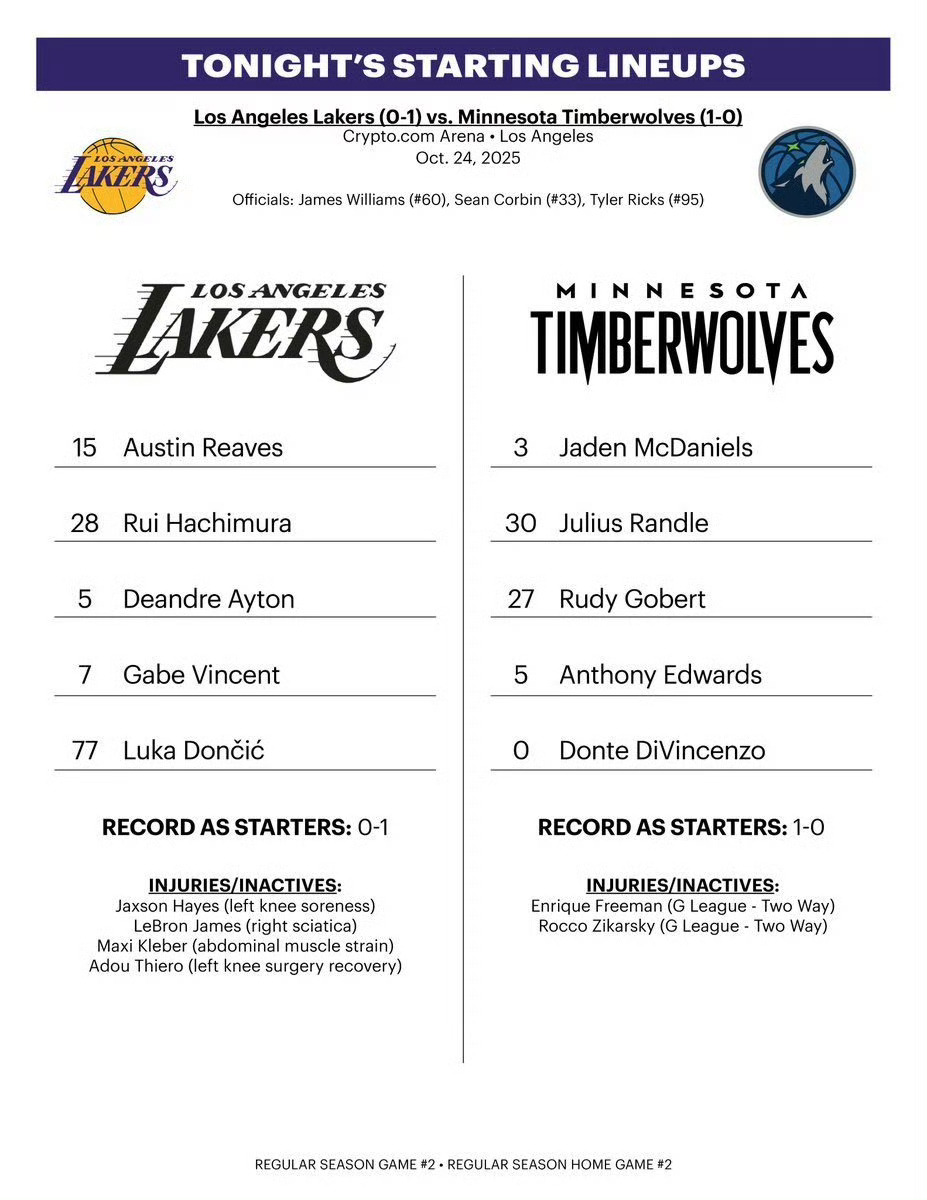 湖人首发:里夫斯、八村、艾顿、文森特以及东契奇!
