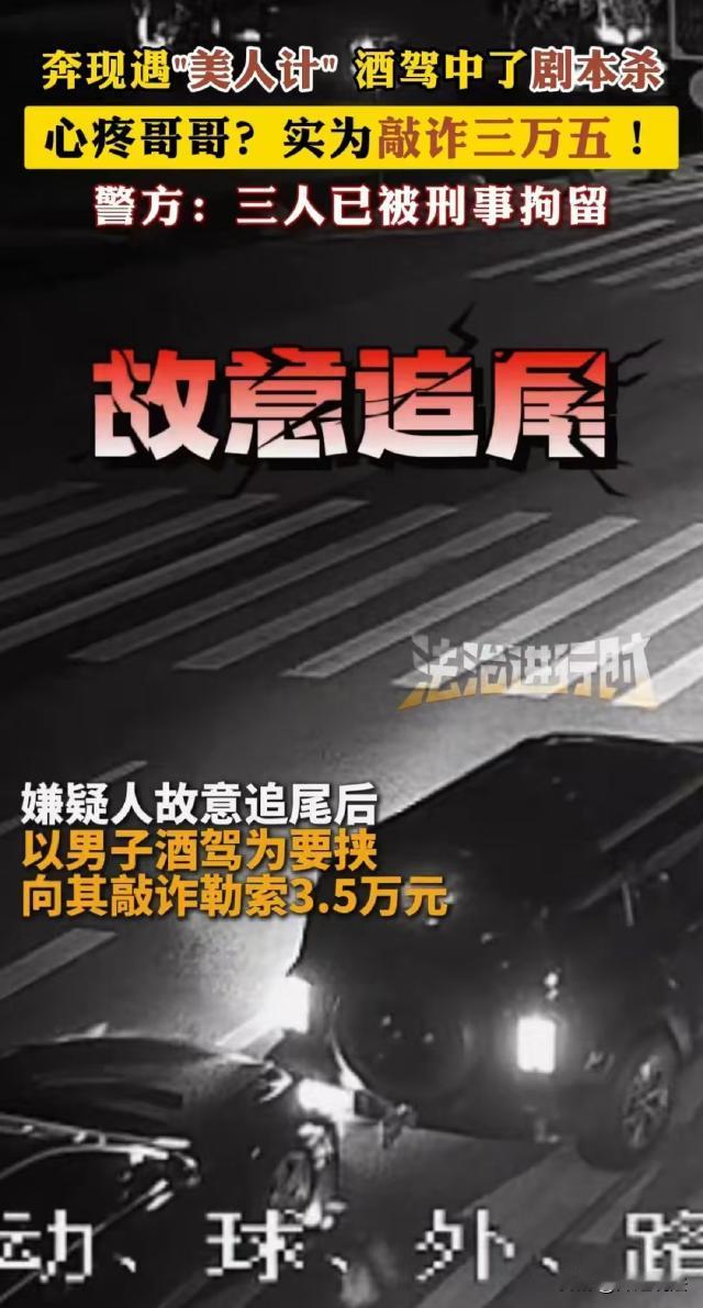 本现中了美人计!辽宁鞍山,男子和女网友奔现,酒后女子怂恿男子开车回家,男子离开后,女子的2名同伙尾随男子制造追尾事故,并以酒驾为由勒索男子3.5万。男子察觉不对立即报警。 据法治进行时报道,该男子不久前认识了一个女网友,女网友非常主动,还时不时给男子发个自拍,没几天就主动邀请男子见面。 男子内心窃喜,答应和女子见面。 女子精挑细选了一家饭店,只是这家店比较远,在城郊。 女子解释说,那边地方大,不仅能吃饭还能玩,而且比较僻静,可以安安静静聊天。 男子没有多想,到了约定时间,一早就开着车去了。女网友化着妆,穿着性感的大领黑裙如期赴约。 饭桌上两人相见恨晚,你一杯我一杯喝得非常畅快,一直到晚上9点多钟才结束。 因为喝了酒,男子准备叫个代驾,可饭店地处偏僻,根本没有人接单。 女网友善解人意地说,这边离市里远,估计没有人愿意来,这么晚了肯定没有人查车,干脆自己开车回去。 男子有点犹豫,女子又劝他,哪能这么倒霉?就这一次肯定抓不住。 男子心存侥幸,于是决定自己开车离开。 可让他没想到的是,他的车刚离开,就有一辆车跟在了他后面。 行驶到一处无人地段,后车突然加速撞了上去,男子下车查看,后车驾驶员突然对他说:你喝酒了吧?给我拿35000块钱,我就不报警! 男子虽然喝多了,可他并不蠢,仔细一想就知道自己被人下了套,不等对方报警,男子自己报警了。 那么,男子和3人团伙会受到什么处罚? 男子在与女网友聚餐后,在女网友怂恿下心存侥幸酒后驾车,这一行为涉嫌酒后驾驶机动车。 根据《道路交通安全法》第九十一条规定,饮酒后驾驶机动车的,处暂扣6个月机动车驾驶证,并处1000元以上2000元以下罚款。因饮酒后驾驶机动车被处罚,再次饮酒后驾驶机动车的,处10日以下拘留,并处1000元以上2000元以下罚款,吊销机动车驾驶证。醉酒驾驶机动车的,由公安机关交通管理部门约束至酒醒,吊销机动车驾驶证,依法追究刑事责任,5年内不得重新取得机动车驾驶证。 男子会受到什么处罚,主要看他血液中酒精含量是否达到醉酒标准。 若经检测,男子血液酒精含量达到酒驾标准但未达醉驾标准,那么按照上述酒驾条款进行处罚。 若达到醉驾标准,男子就构成危险驾驶罪,依据《刑法》第一百三十三条之一规定,在道路上醉酒驾驶机动车的,处拘役,并处罚金。 那么,3人团伙又会受到什么处罚? 女网友及其两名同伙的行为构成了敲诈勒索罪。三人精心策划此次骗局,女网友主动与男子相识并邀请见面,选择城郊偏僻饭店,在男子酒后怂恿其开车,然后尾随制造追尾事故,以男子酒驾为由勒索3.5万元。 根据《刑法》第二百七十四条规定,敲诈勒索公私财物,数额较大或者多次敲诈勒索的,处三年以下有期徒刑、拘役或者管制,并处或者单处罚金;数额巨大或者有其他严重情节的,处三年以上十年以下有期徒刑,并处罚金;数额特别巨大或者有其他特别严重情节的,处十年以上有期徒刑,并处罚金。 根据相关司法解释,敲诈勒索公私财物价值二千元至五千元以上、三万元至十万元以上、三十万元至五十万元以上的,应当分别认定为刑法第二百七十四条规定的“数额较大”“数额巨大”“数额特别巨大” 。 本案中,该团伙勒索男子3.5万元,已达到数额巨大标准,应处三年以上十年以下有期徒刑,并处罚金。 此外,他们制造追尾事故的行为,若造成车辆损坏等财产损失,还可能涉及故意毁坏财物的民事赔偿责任。 如果其行为导致人员受伤,根据伤害程度不同,可能还会触犯《刑法》中关于故意伤害罪等相关条款。 男子报警后,民警很快锁定并抓获了3名嫌疑人。目前,3人已被刑事拘留,男子则被移交给监管部门处理。