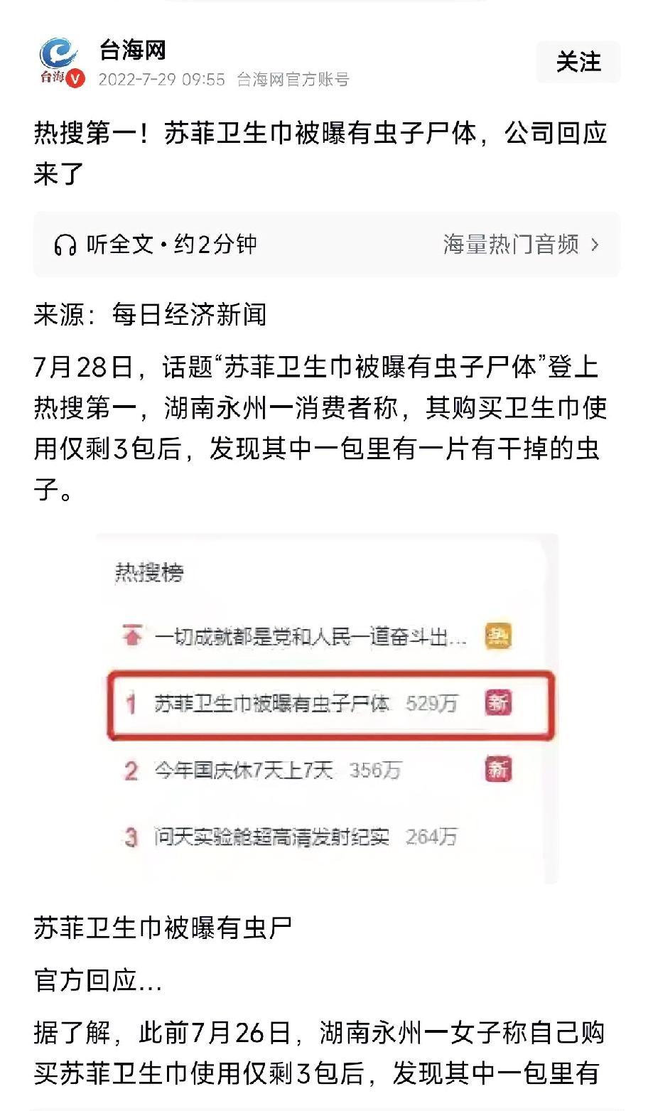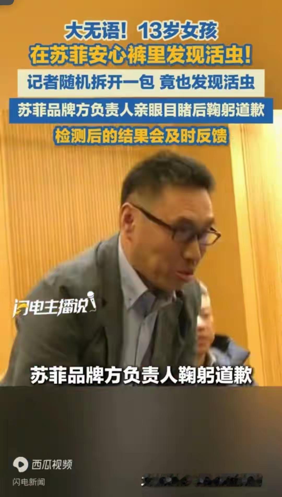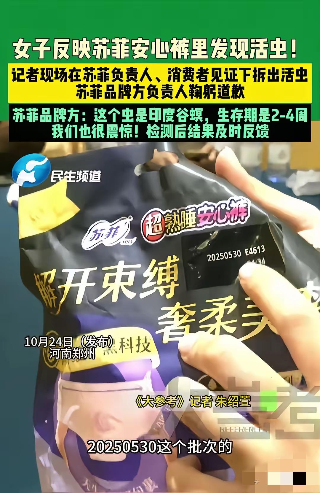苏菲真的该好好重视一下了 不单单是这次活虫事件该调查清楚, 因为我去查了查,居然发现3年前就有类似的事件了,那次是爆出有虫子尸体!所以这回应该是整个生产销售过程,都需要好好自查一下,到底是什么原因,让一个问题三年后还会出现,而且这次更加夸张,是活虫。 活生生的虫子,会动的虫子,让人背后发凉的感觉! 三年前,2022年7月份,是发生在湖南永州,也是一个女士在购买使用了几包卫生巾后,在仅存的3包里才发现有虫子的尸体! 我猜测,真有可能是原料的问题,就是有虫卵在里面,成功的躲过了各个生产环节,甚至是高温消毒等,然后在最近一两个月,孵化出来了。 大家觉得有没有这么一种的可能呢?