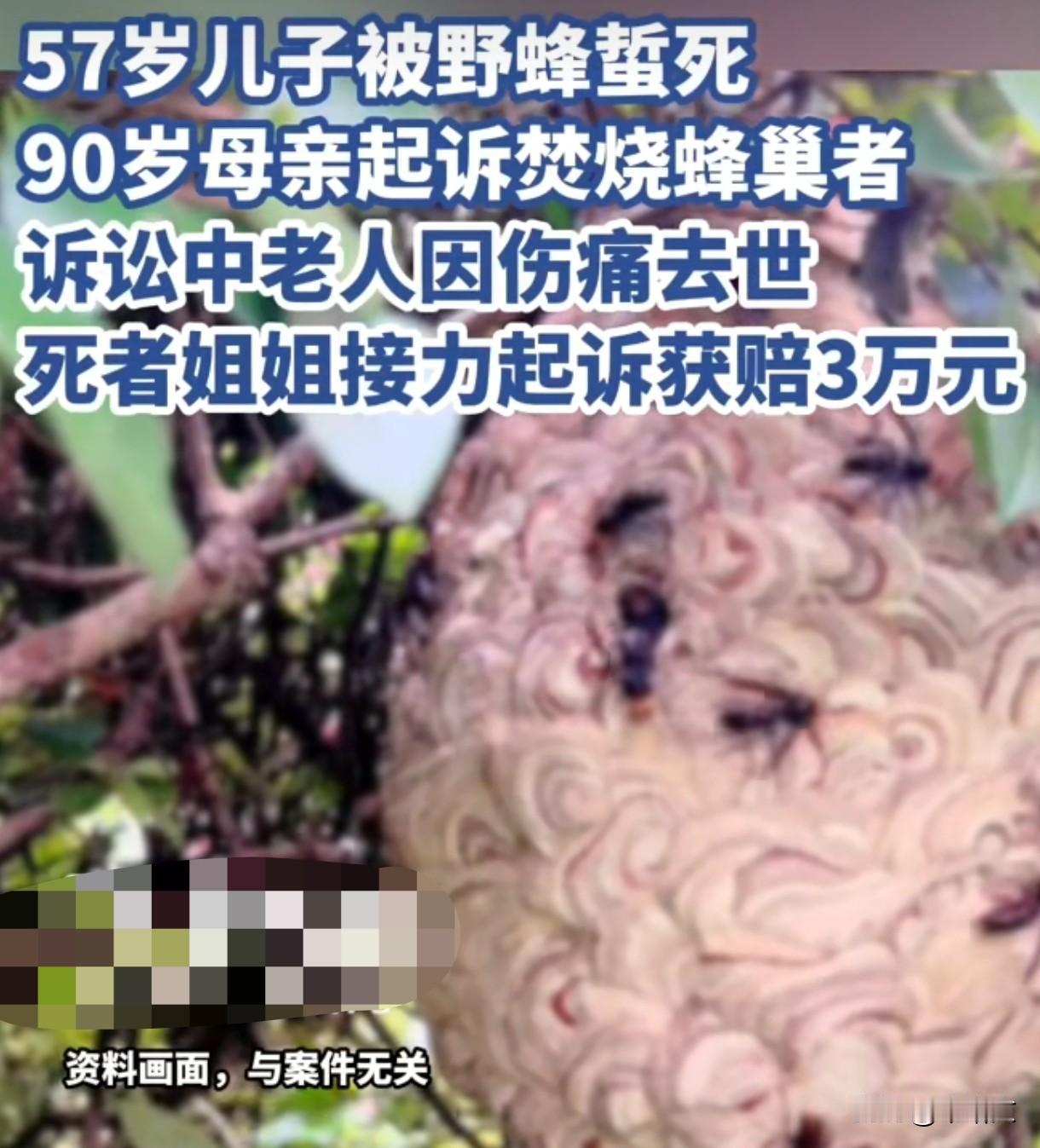 摘蜂巢惹出两条人命?57岁儿被蜇死,90岁妈痛逝,这教训太沉重! 湖北宣恩出了桩揪心事儿!57岁的刘某在后山干活,被野蜂活活蜇死,90岁老母亲受不了打击也跟着走了,最后竟把同村两人告了,这到底咋回事? 咱把这事儿捋清楚。事发前一周,同村的夏某和李某,瞅见刘某家后山有个野蜂窝,既能卖钱又能除隐患,就用火烧赶跑蜂子,把蜂巢摘走卖了。 谁承想一周后,刘某去后山劳作,一群没了家的野蜂突然扑上来,照着他一顿猛蜇。送到医院抢救,还是没救回来,57岁的人就这么没了。 90岁的朱老太一听儿子没了,当场就垮了。她认定儿子的死是夏、李两人摘蜂巢闹的,一纸诉状把他俩告到法院,要讨个说法。 可没等案子判下来,朱老太年纪太大,又遭了丧子的重击,身体撑不住,撒手人寰了。好好的一家子,转眼没了俩,街坊邻居看着都心疼。 没办法,死者的姐姐刘某芬接下了担子,接着替弟弟维权。开庭那天,法院又组织调解,最后夏、李两人赔了3万块,这事儿才算有了了结。 有人可能问,摘个蜂巢咋能惹出人命?其实野蜂这东西,没了巢穴会变得特别凶,攻击性翻倍。夏、李只想着卖钱,压根没管后续危险。 之前贵州也出过类似的事,俩男子摘马蜂窝,结果几天后路过的老人被蜂群蜇死,最后法院判他俩赔了30多万。这可不是小事,弄不好就得担责任。 法院为啥让赔?不是说直接赖他俩,但摘蜂巢后没提醒、没除隐患,这就是疏忽。野蜂蜇人虽不是必然,但他俩的行为确实埋下了祸根。 这事儿给咱敲了警钟:别随便碰野蜂窝!真要处理得找专业人来,自己瞎折腾,万一伤了人,赔钱是小,出人命就真说不清了。 还有,做事得有始有终。夏、李要是摘完蜂巢后贴个警示,或者彻底处理干净,说不定就不会出这悲剧。图省事的代价,往往太沉重。 一场意外两条人命,说到底还是大意惹的祸。你身边见过野蜂伤人的事吗?遇上这情况该咋处理?评论区唠唠,咱都学学咋避险!