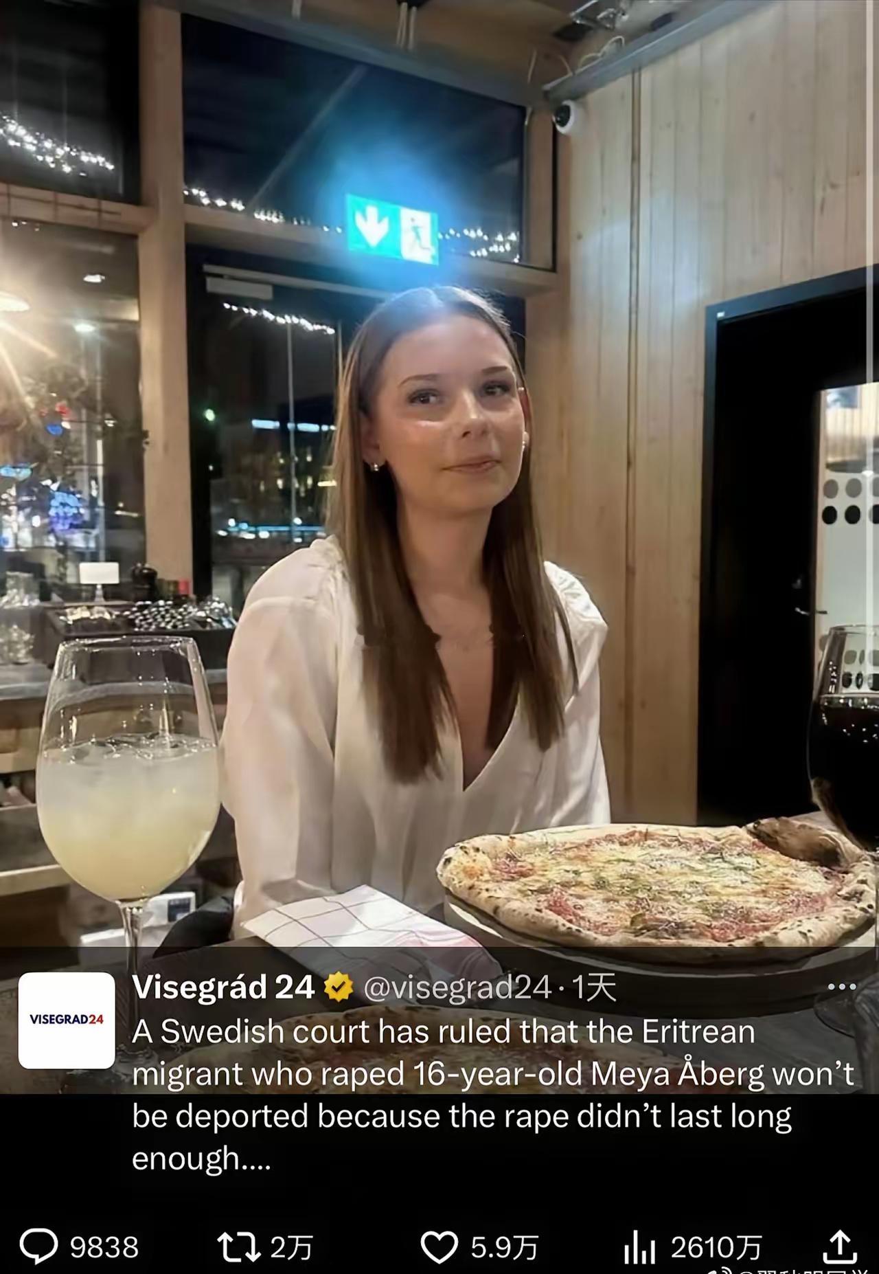 瑞典女孩被东非难民性侵瑞典16岁女孩Meya Åberg因错过公交车选择走路回家时被来自厄立特里亚的难民在步行隧道里性侵。瑞典法院判处被告3年监禁,但未下达驱逐出境令。原因之一是“犯罪持续时间不够长”,所以达不到“特别严重犯罪”的门槛………