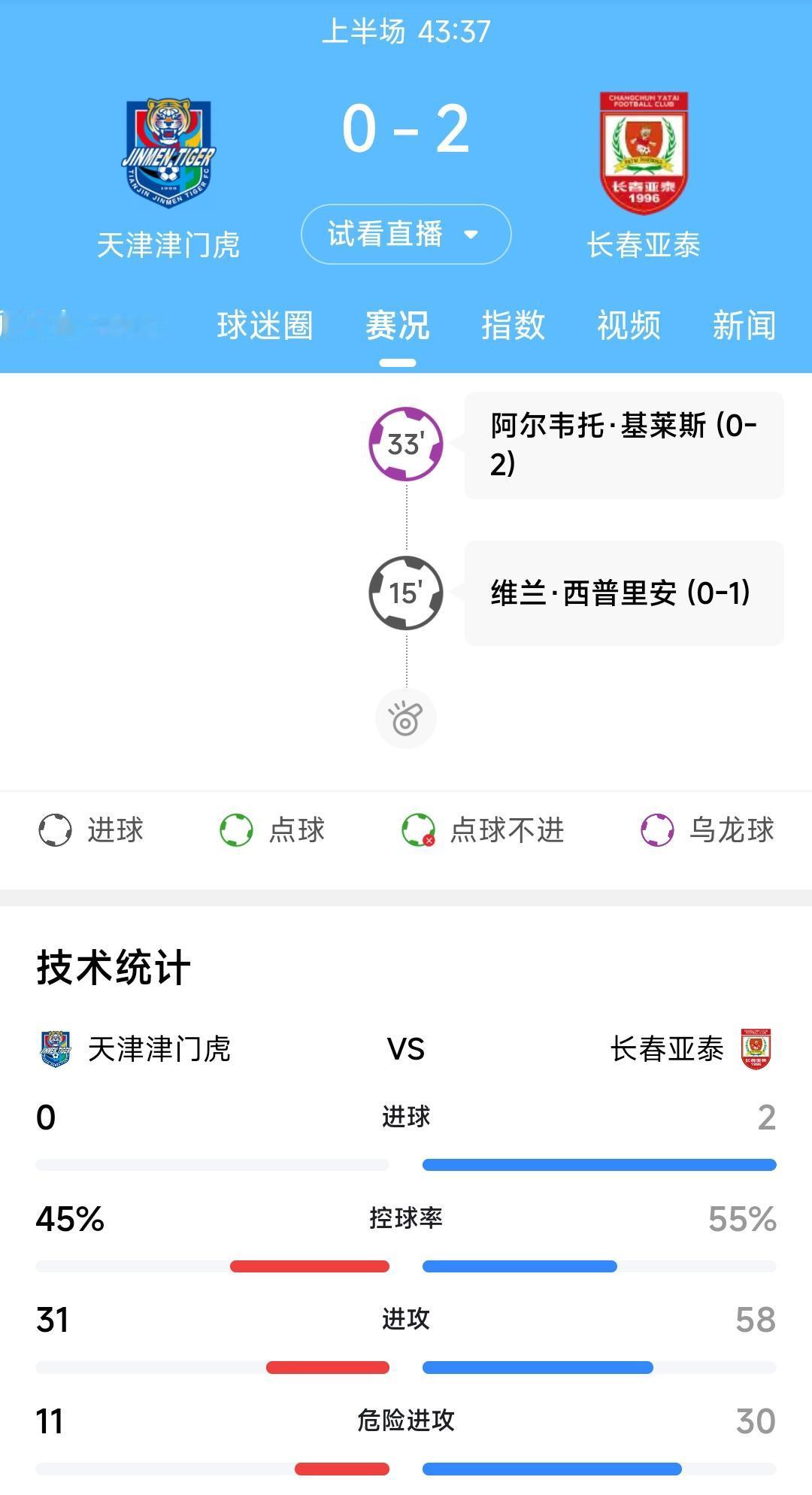 长春亚泰状态回暖,上半场2:0领先天津津门虎。更难得的是控球率长春亚泰能达到45%的水准,这跟之前踢河南队的表现有很大的天壤之别。 这样看来长春亚泰在外援重新回归后前场进攻能力有了明显的提高,再加上天津津门虎最近饱受伤病的困扰,因此长春亚泰打出了很不错的上半场。希望下半场比赛长春能够把胜利收入囊中,毕竟接下来长春亚泰面对的北京国安、青岛西海岸同样不好对付。