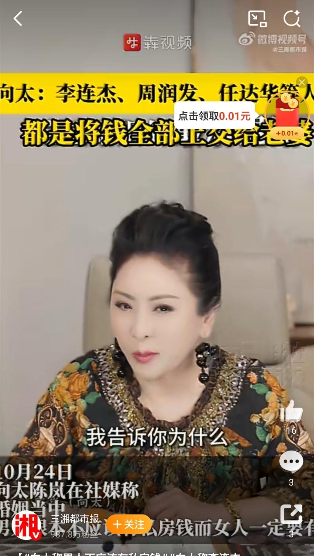 向太称男人不应该有私房钱男人的私房钱就像汽车的备胎,你可以一辈子不用,但你不能没有。不是为了跑路,只是为了在爆胎(突发应酬、想给老婆惊喜、兄弟救急)时,能体面地开去修理厂(解决问题),而不至于在路边呼叫拖车(打电话向老婆求救)
