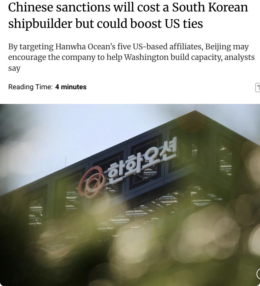 外媒:中国对韩国造船巨头Hanwha Ocean的制裁可能会导致该公司中期内成本上升,但长期来看可能会加强韩国与美国的关系。 中国对Hanwha Ocean的五家美国子公司实施制裁,原因是该公司支持美国对中企的调查及新港口费用的实施。 韩国总统李在明曾访问Hanwha集团以1亿美元收购的美国费城造船厂,该厂是美韩“让美国造船业再次伟大”合作项目的一部分,旨在通过韩国投资振兴美国造船业,项目总额可能达1500亿美元。